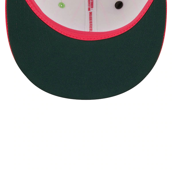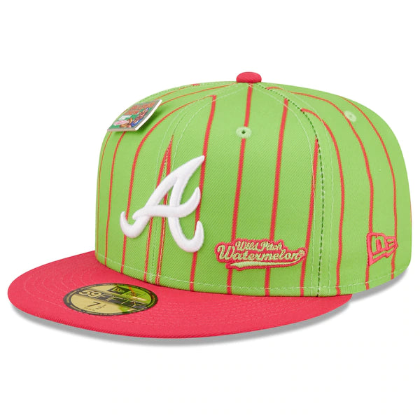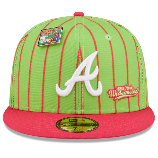 The MLB and Big League Chew have teamed up to bring Atlanta Braves fans this one of a kind, Wild Pitch Watermelon Flavor Pack 59FIFTY Fitted Hat. Featuring a high crown and flat bill, this New Era hat will take your game day look to the next level. Its classic and fun graphics combine your Atlanta Braves and your all-time favorite Big League Chew flavor, making it unlike anything else in your collection.
