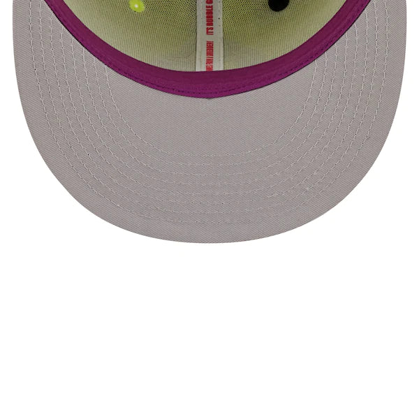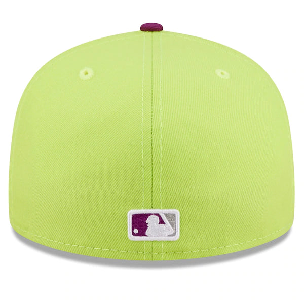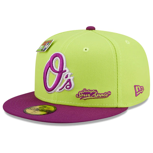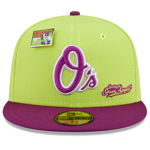The MLB and Big League Chew have teamed up to bring Baltimore Orioles fans this one of a kind, Swingin' Sour Apple Flavor Pack 59FIFTY Fitted Hat. Featuring a high crown and flat bill, this New Era hat will take your game day look to the next level. Its classic and fun graphics combine your Baltimore Orioles and your all-time favorite Big League Chew flavor, making it unlike anything else in your collection.