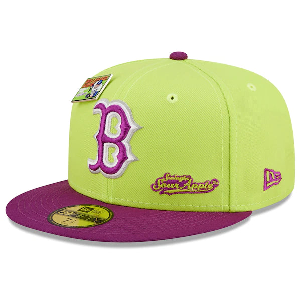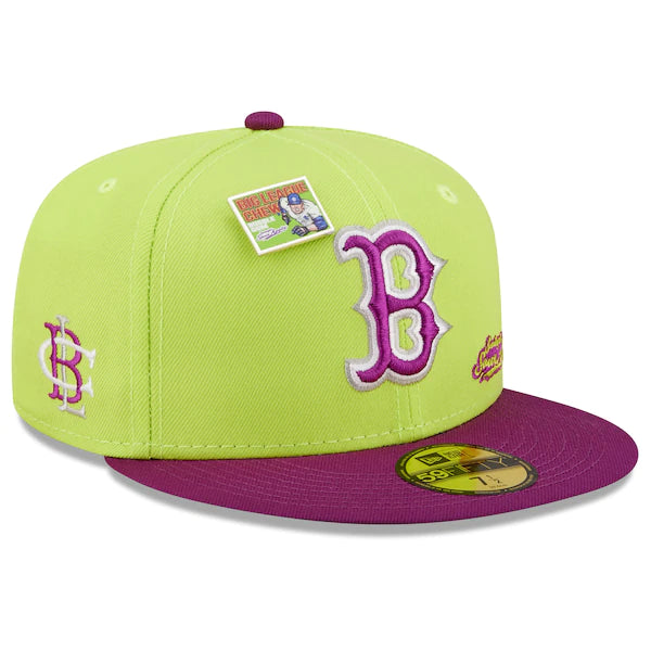 The MLB and Big League Chew have teamed up to bring Boston Red Sox fans this one of a kind, Swingin' Sour Apple Flavor Pack 59FIFTY Fitted Hat. Featuring a high crown and flat bill, this New Era hat will take your game day look to the next level. Its classic and fun graphics combine your Boston Red Sox and your all-time favorite Big League Chew flavor, making it unlike anything else in your collection.