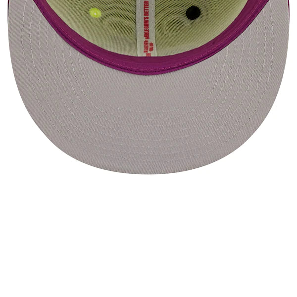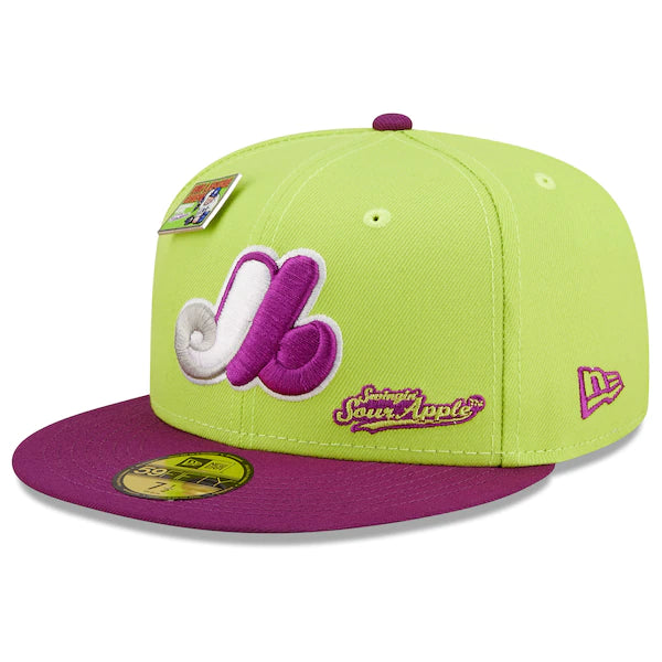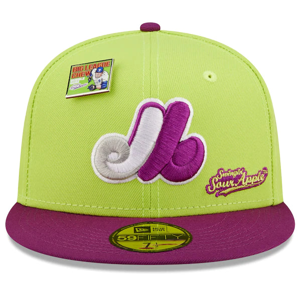The MLB and Big League Chew have teamed up to bring Montreal Expos fans this one of a kind, Swingin' Sour Apple Flavor Pack 59FIFTY Fitted Hat. Featuring a high crown and flat bill, this New Era hat will take your game day look to the next level. Its classic and fun graphics combine your Montreal Expos and your all-time favorite Big League Chew flavor, making it unlike anything else in your collection.