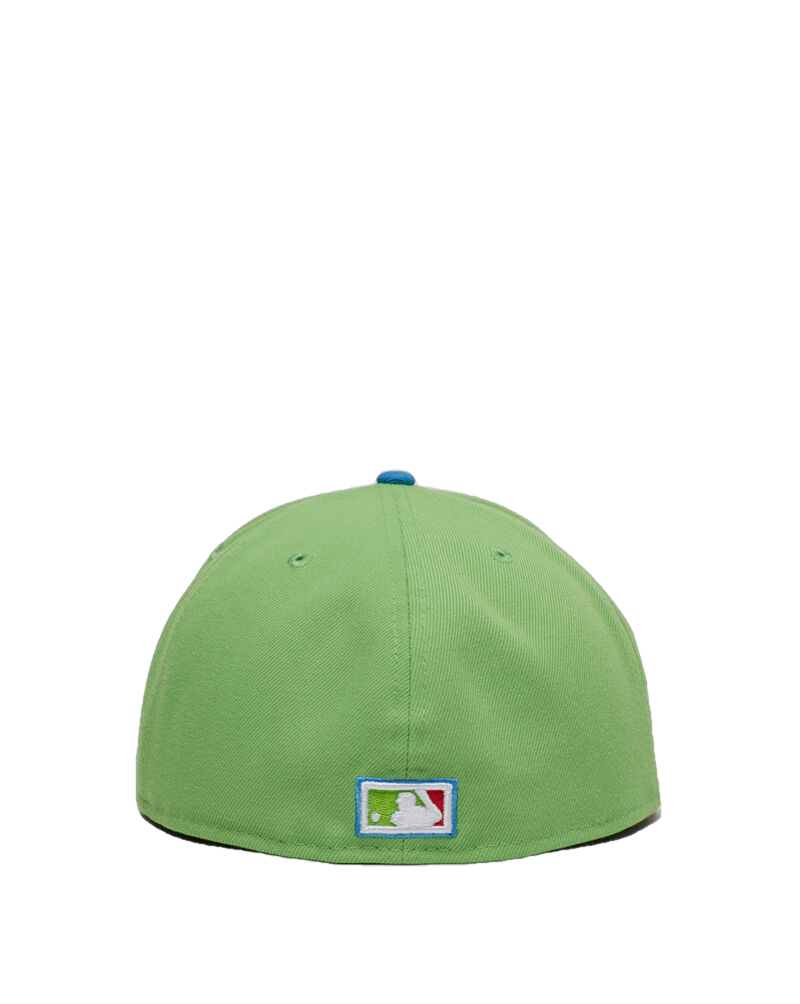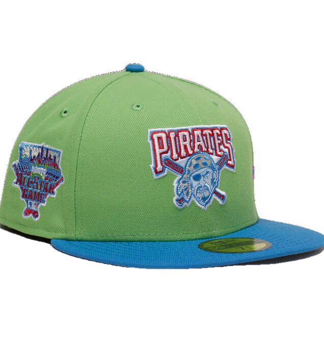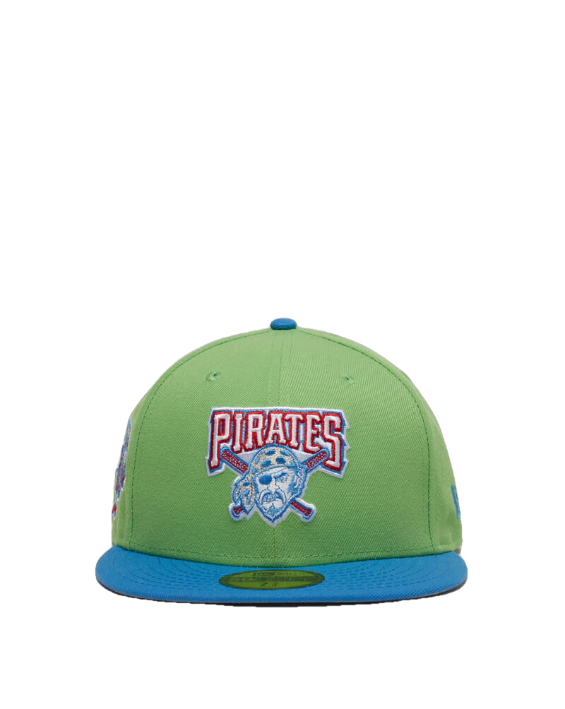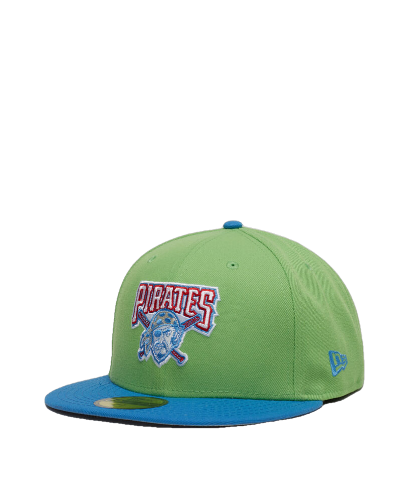 This New Era Pittsburgh Pirates "Quarter Water"59FIFTY fitted hat has a lime six panel construction including embroidered eyelets with a blue fabric squatchee button. The flat bill of the fitted is also blue with a metallic silver bottom undervisor. The front panel features the Pittsburgh Pirates logo embroidery and a 2006 All-Star Game side patch on the right panel. The fitted hats colorways were inspired by the childhood barrel-shaped drinks sold in bodegas known as "Quarter Water".