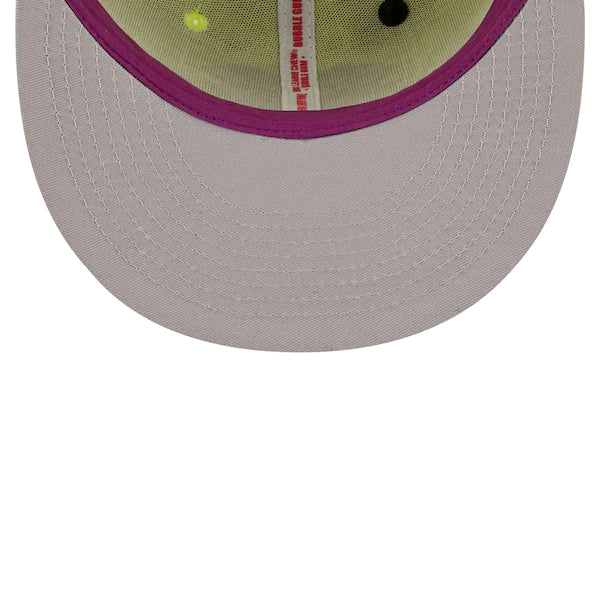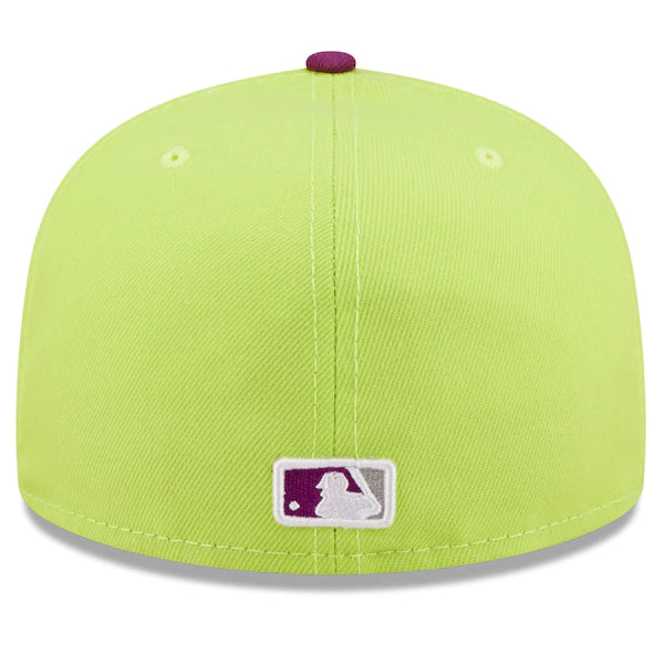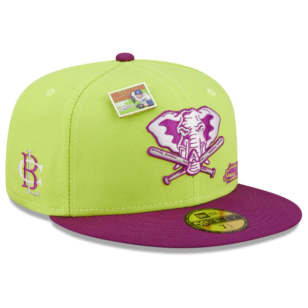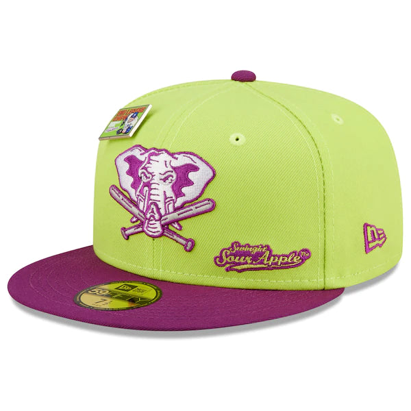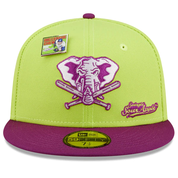 The MLB and Big League Chew have teamed up to bring Oakland Athletics fans this one of a kind, Swingin' Sour Apple Flavor Pack 59FIFTY Fitted Hat. Featuring a high crown and flat bill, this New Era hat will take your game day look to the next level. Its classic and fun graphics combine your Oakland Athletics and your all-time favorite Big League Chew flavor, making it unlike anything else in your collection.