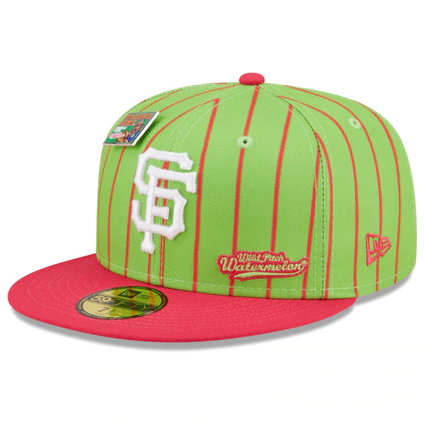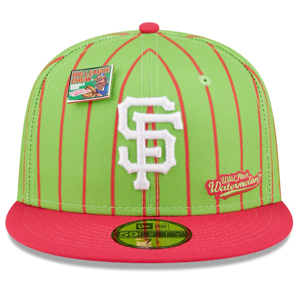 The MLB and Big League Chew have teamed up to bring San Francisco Giants fans this one of a kind, Wild Pitch Watermelon Flavor Pack 59FIFTY Fitted Hat. Featuring a high crown and flat bill, this New Era hat will take your game day look to the next level. Its classic and fun graphics combine your San Francisco Giants and your all-time favorite Big League Chew flavor, making it unlike anything else in your collection.