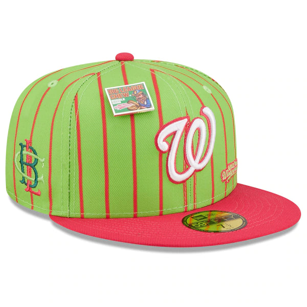 The MLB and Big League Chew have teamed up to bring Washington Nationals fans this one of a kind, Wild Pitch Watermelon Flavor Pack 59FIFTY Fitted Hat. Featuring a high crown and flat bill, this New Era hat will take your game day look to the next level. Its classic and fun graphics combine your Washington Nationals and your all-time favorite Big League Chew flavor, making it unlike anything else in your collection.