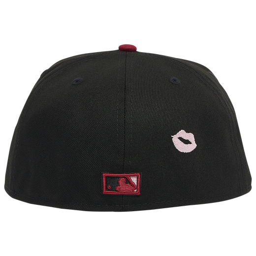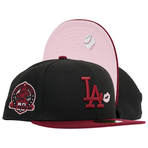 This New Era 59FIFTY Los Angeles Dodgers fitted was released by Champs Sports. The fitted has a black six panel structured high crown and embroidered eyelets with a burgundy fabric squatchee button and flat bill. The front panel features the Los Angeles Dodgers logo embroidery in burgundy stitching with pink lips embroidery on the front and rear crown and a pink undervisor. The fitted has a 60th Anniversary side patch on the right panel.