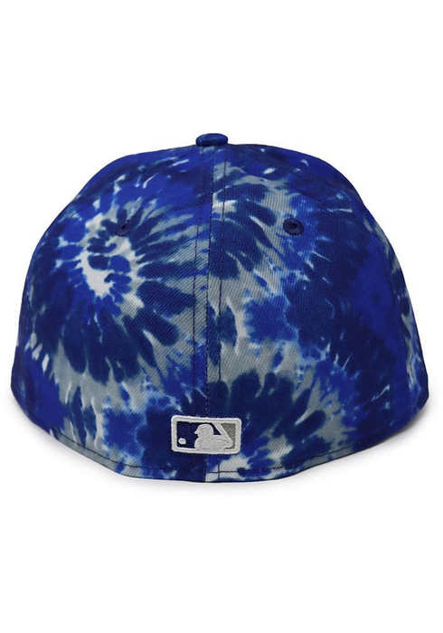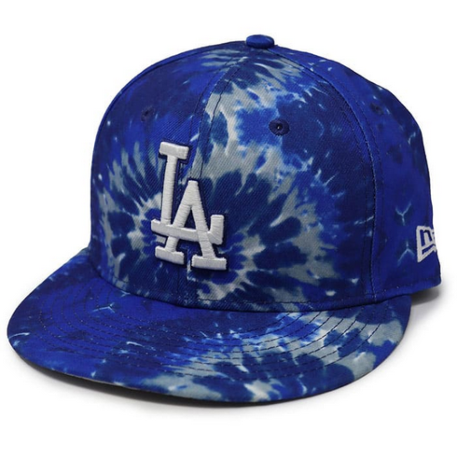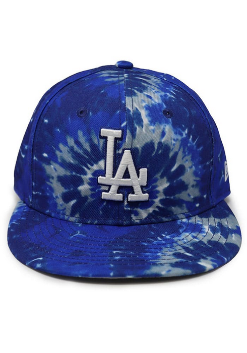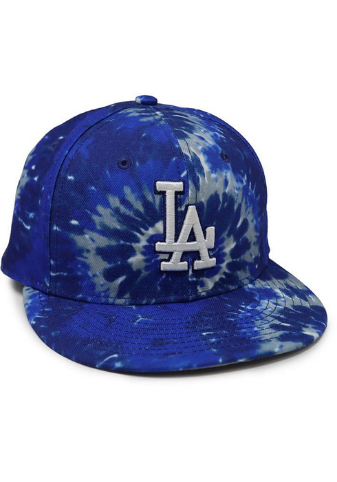 This New Era Los Angeles Dodgers 59FIFTY fitted hat has a blue tie dye six panel structured high crown and embroidered eyelets, flat bill and fabric squatchee button located at the top of the crown. Additional details include the LA Dodgers logo embroidery.