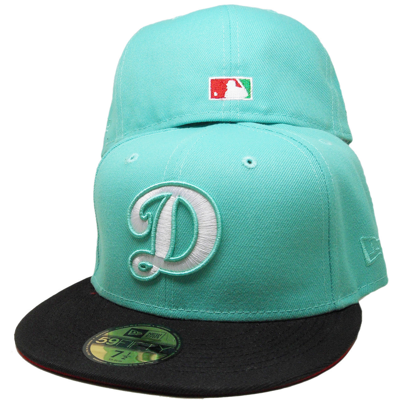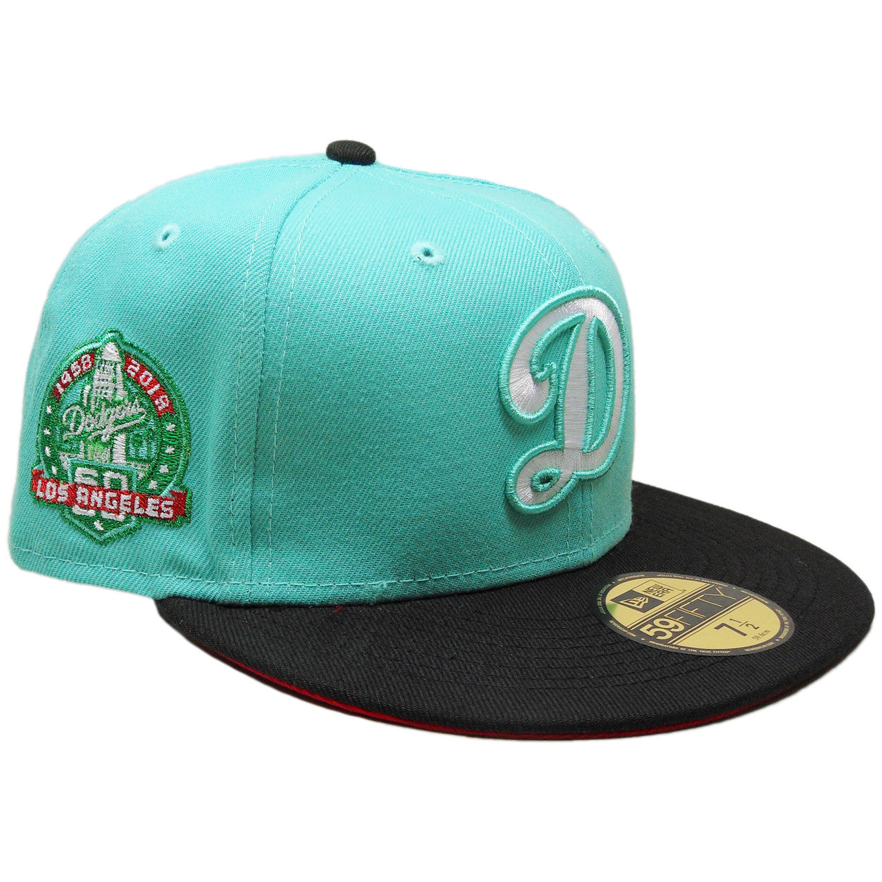This New Era Los Angeles Dodgers Mint Green/Black 60th Anniversary 59FIFTY Fitted Hat was released by Ecapsunlimited. The fitted has a mint green six panel structured high crown and embroidered eyelets with a black fabric squatchee button. The fitted cap also has a black flat visor with a red undervisor and white sweatband. The front panel features the New York Mets logo embroidery and a 60th Anniversary side patch embroidery on the right panel. The left panel of the fitted displays the New Era logo and the official MLB logo embroidery on the rear crown.