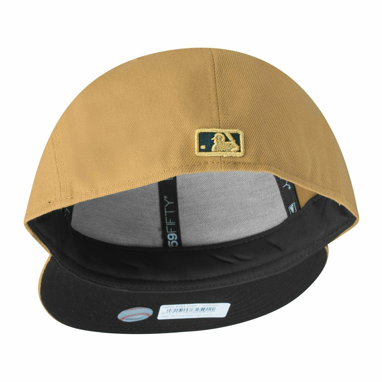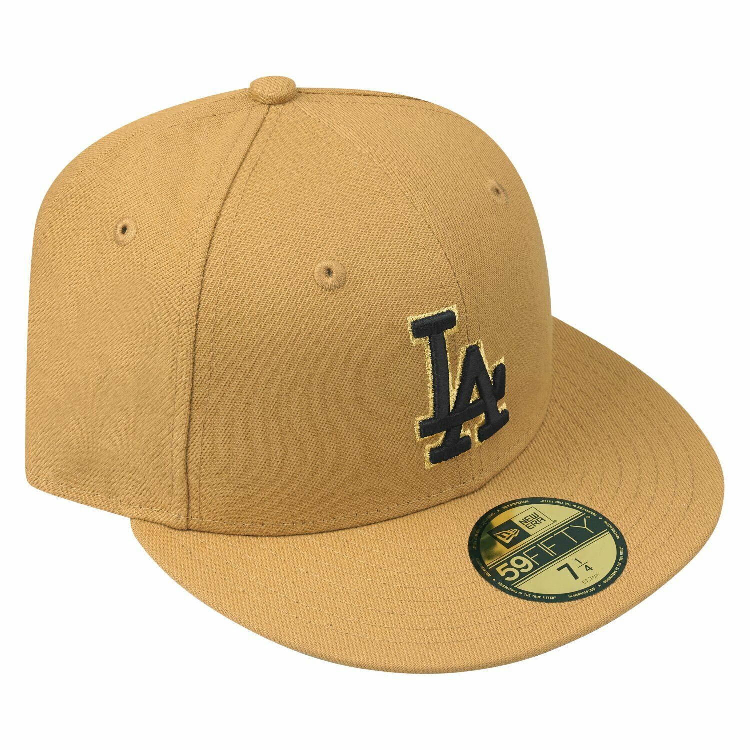 This New Era Los Angeles Dodgers fitted hat has a Panama Tan colorway. The six panel structured high crown, embroidered eyelets and fabric squatchee button are Panama Tan. The flat bill of the fitted is also Panama tan with a black sweatband.