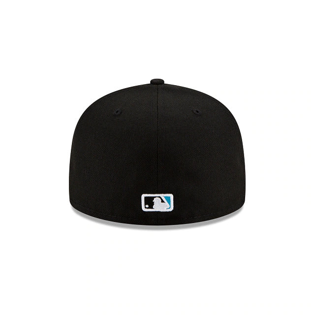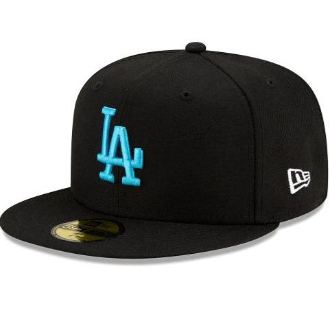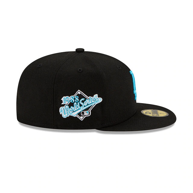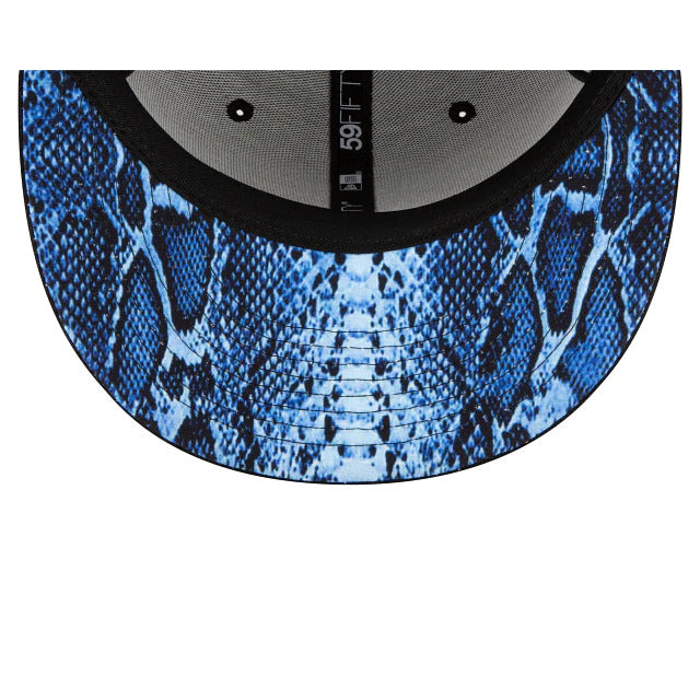 The Los Angeles Dodgers Summer Pop 59FIFTY Fitted Cap features a neon Dodgers logo embroidered at the front panels with a World Series patch at the right-wear side and a matching MLB Batterman logo at the rear. Additional details include a snakeskin print undervisor.