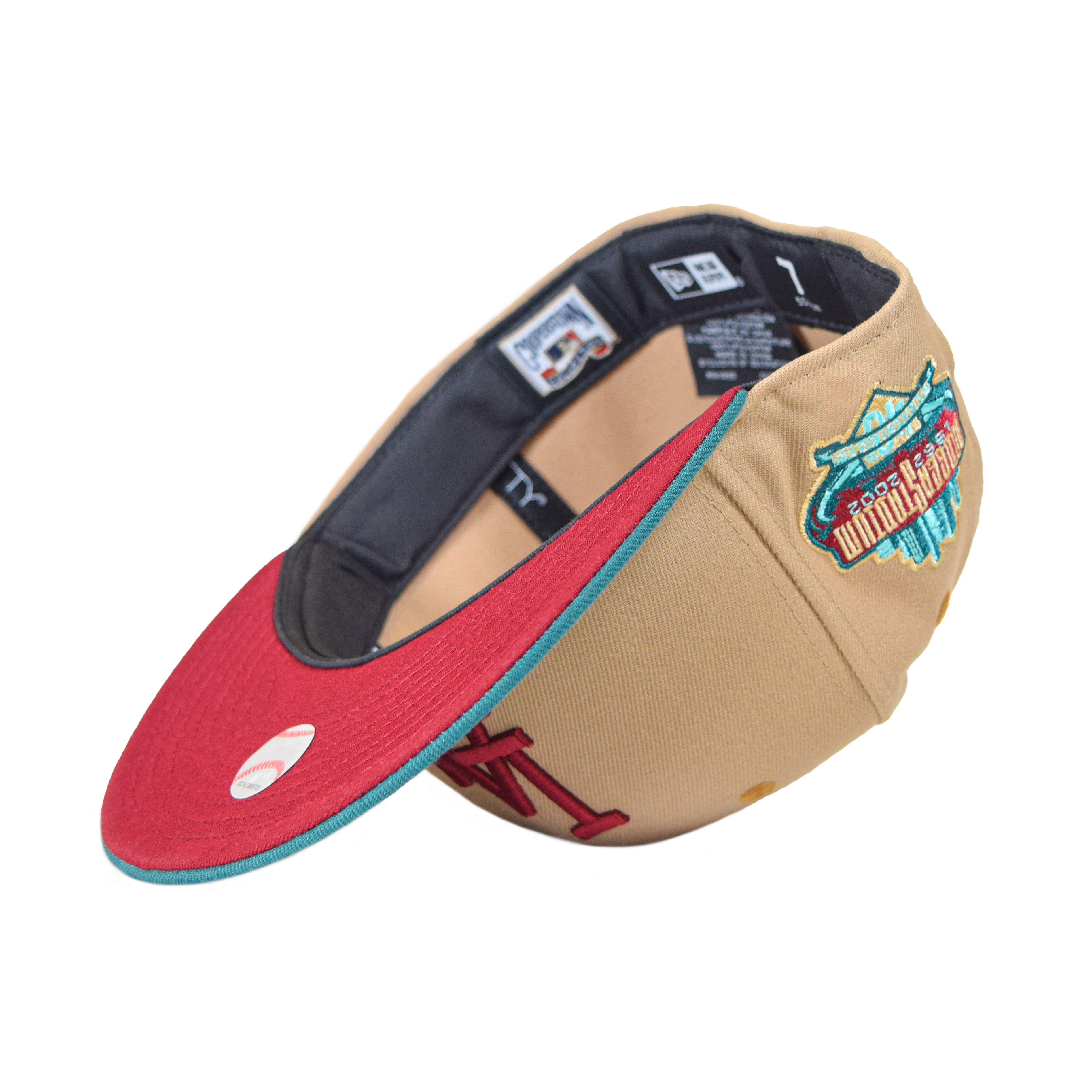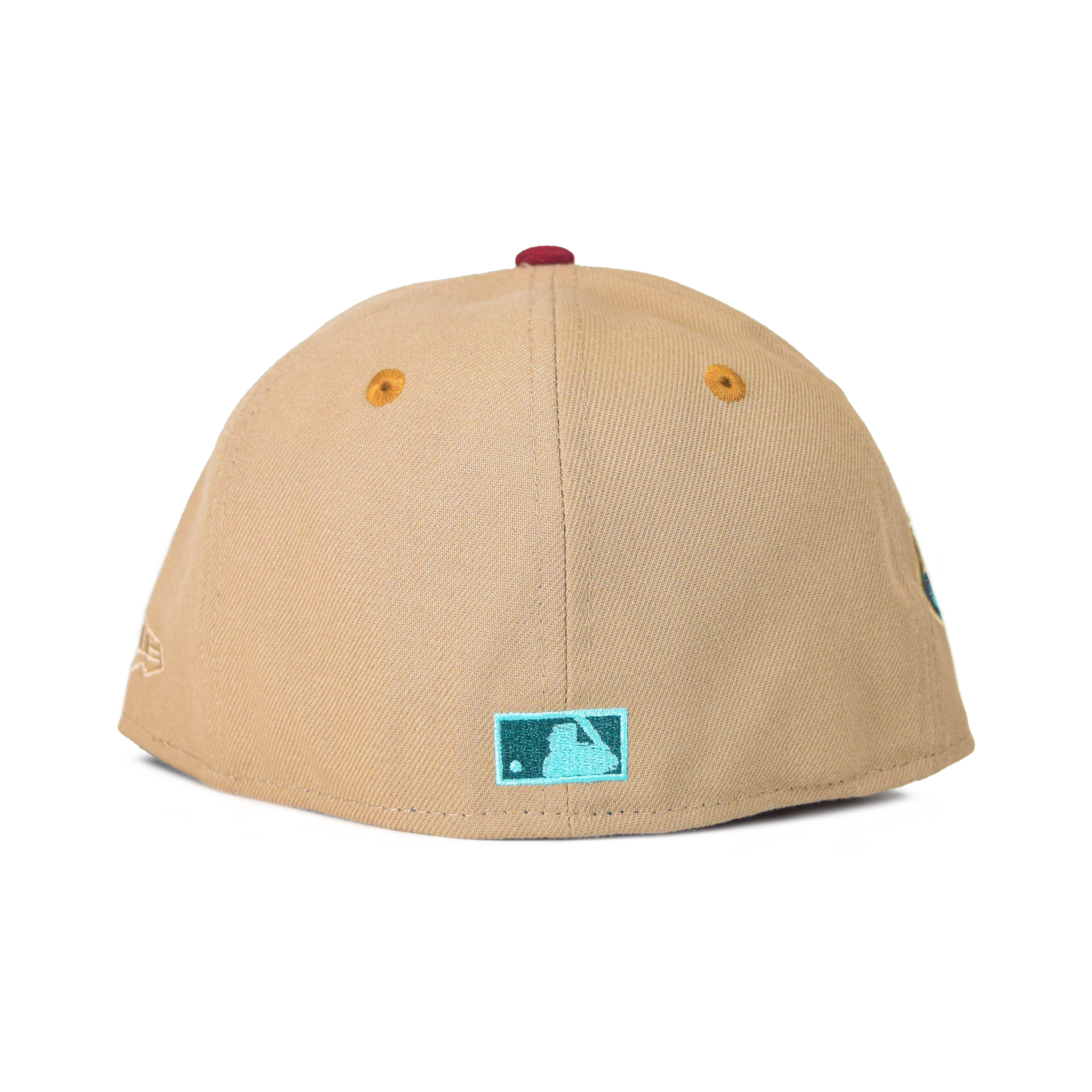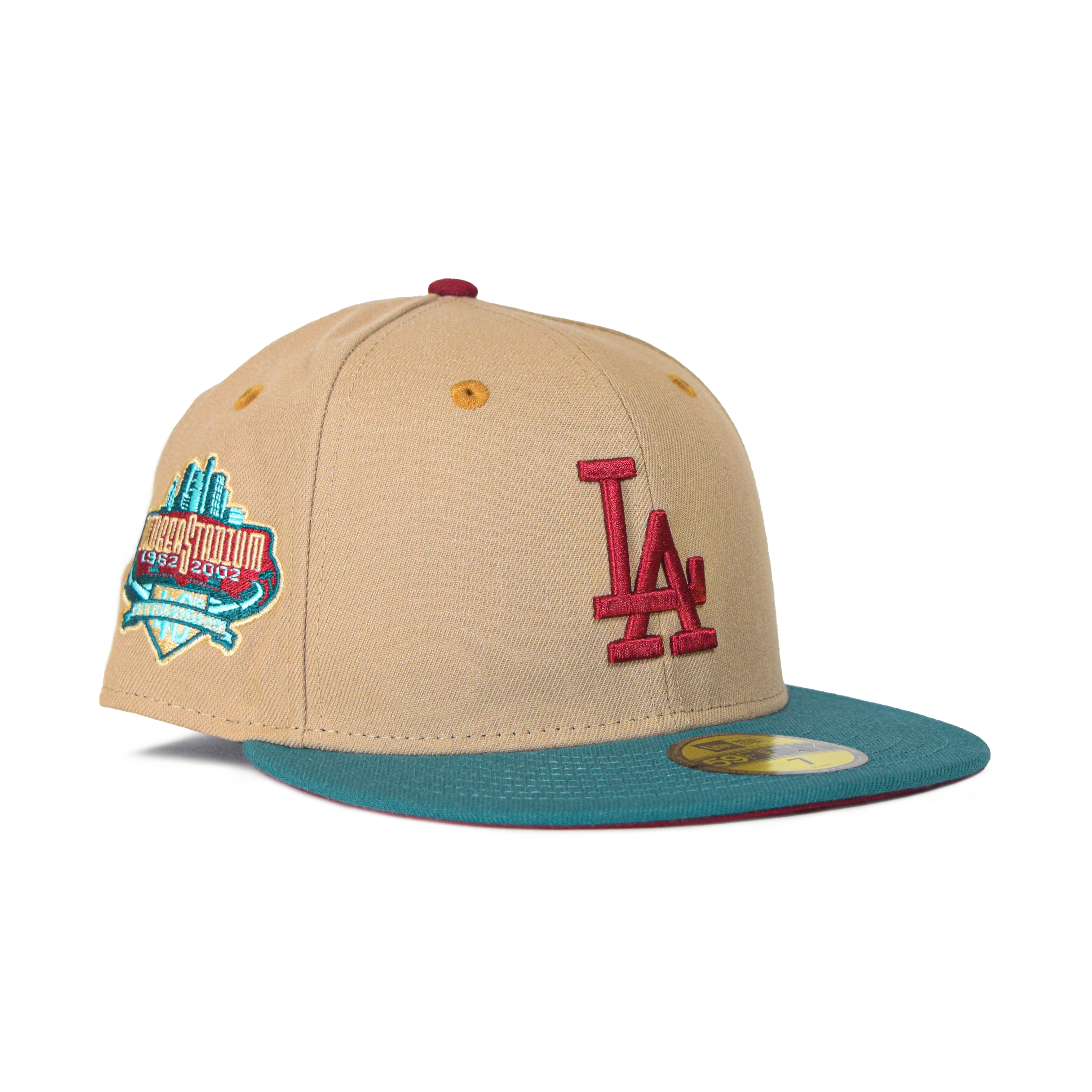 This New Era New Era x Capanova Los Angeles Dodgers 'No Hook' 59FIFTY Fitted Hat was released by Capanova. The Los Angeles Dodgers 59FIFTY fitted features a tan six panel construction with orange embroidered eyelets and cardinal red fabric squatchee button. The fitted has a pine green (approximate color) flat bill and a cardinal red undervisor. The front panel features the Los Angeles Dodgers logo embroidery and a side patch on the right-wear side.