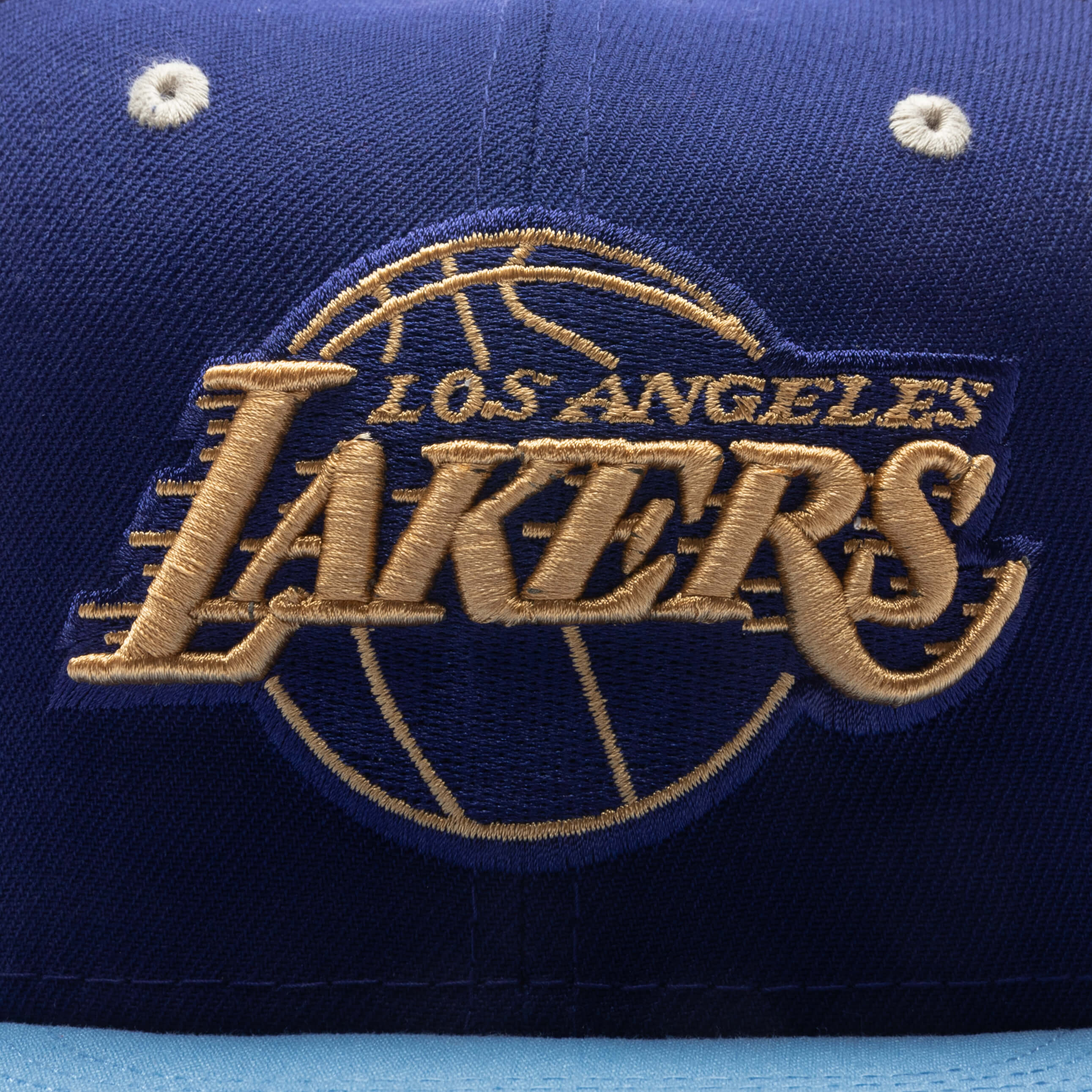 This New Era x Feature Los Angeles Lakers Navy/Sky/Tan 2023 59FIFTY Fitted Hat was released by Feature. The fitted has a navy blue six panel structured high crown, tan embroidered eyelets and a tan fabric squatchee button. The flat bill of the fitted cap is sky blue with a tan undervisor and black sweatband. The front panel features the Los Angeles Lakers logo embroidered in navy blue and tan stitching. The left panel of the fitted displays the New Era logo and celebratory side patch on the right panel. The official NBA & Feature logos are embroidered on the rear crown in tan stitching as well.