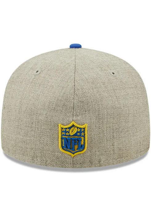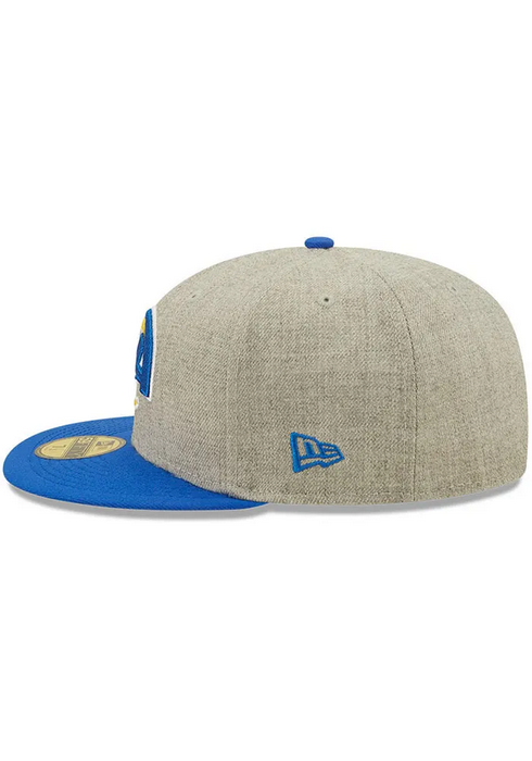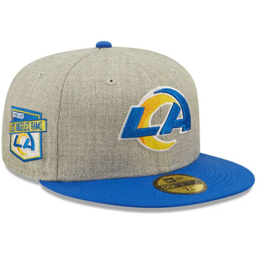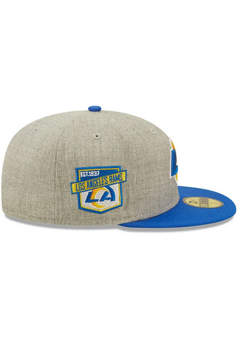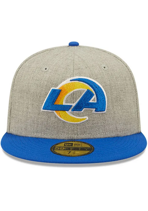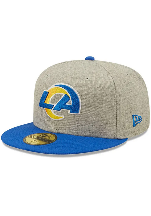 This Las Angeles Rams Heather Grey fitted hat has a six panel structure high crown, embroidered eyelets, fabric squatchee button, flat bill and a side patch on the right-wear side.
