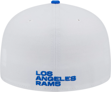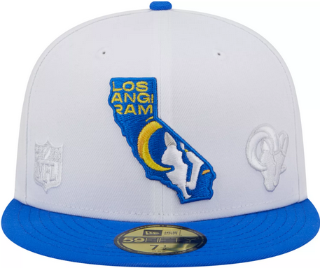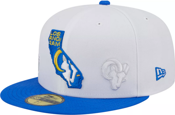 This New Era Los Angeles Rams State 59FIFTY fitted hat has a white six panel structured high crown and embroidered eyelets with a blue fabric squatchee button and flat bill. The front panel features the Los Angeles Rams logo embroidered inside a state logo graphic.