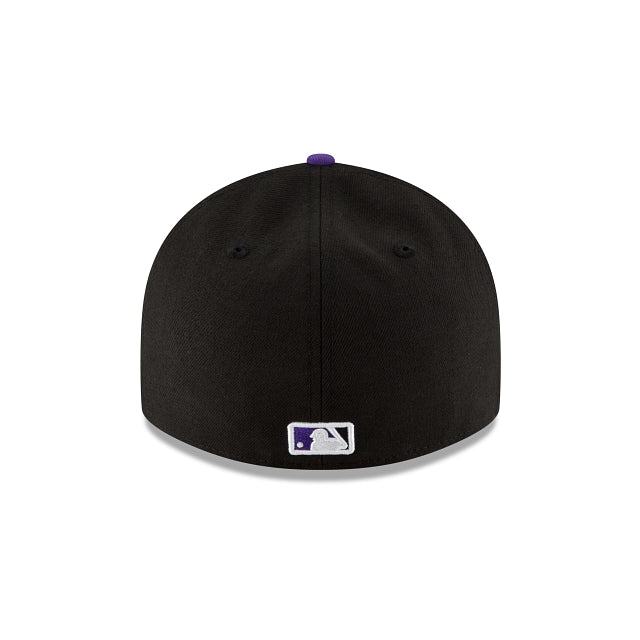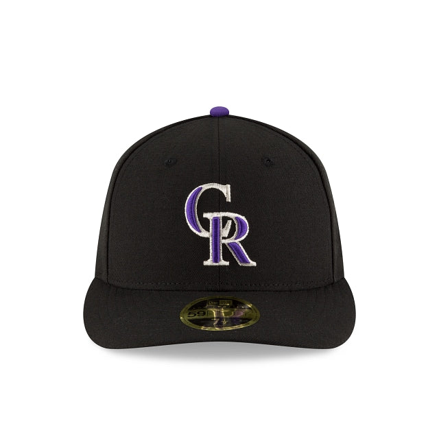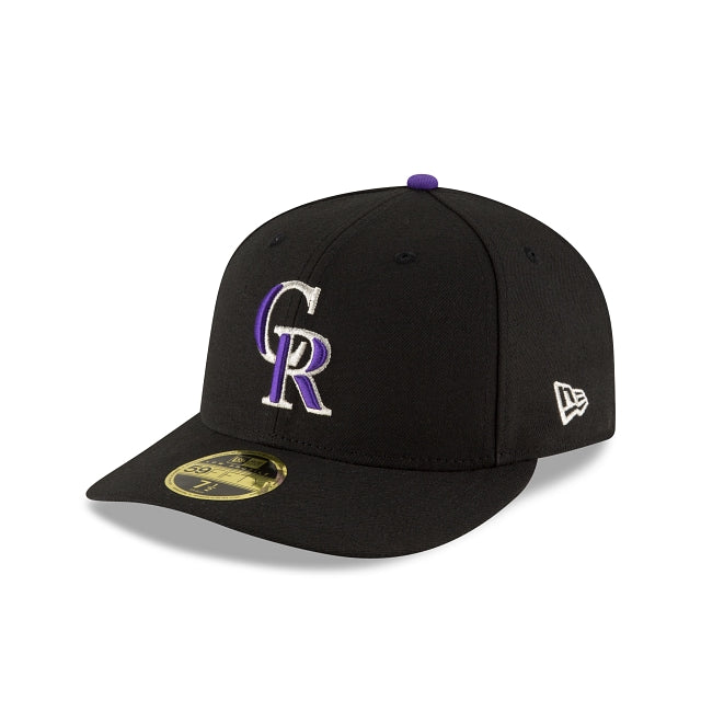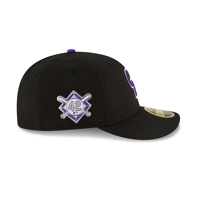 The Colorado Rockies Jackie Robinson Day Low Profile 59FIFTY Fitted Cap features an embroidered Rockies logo at the front panels, a Jackie Robinson Day patch at the right-wear side, and an MLB Batterman logo at the rear.