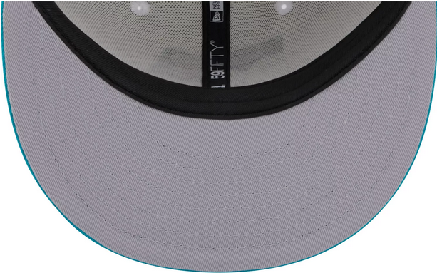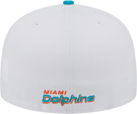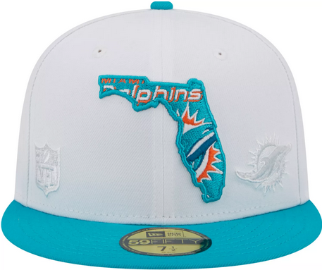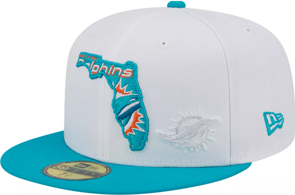 This New Era Miami Dolphins State 59FIFTY fitted hat has a white six panel structured high crown and embroidered eyelets with a teal fabric squatchee button and flat bill. The front panel features the Miami Dolphins logo embroidered inside a state logo graphic.