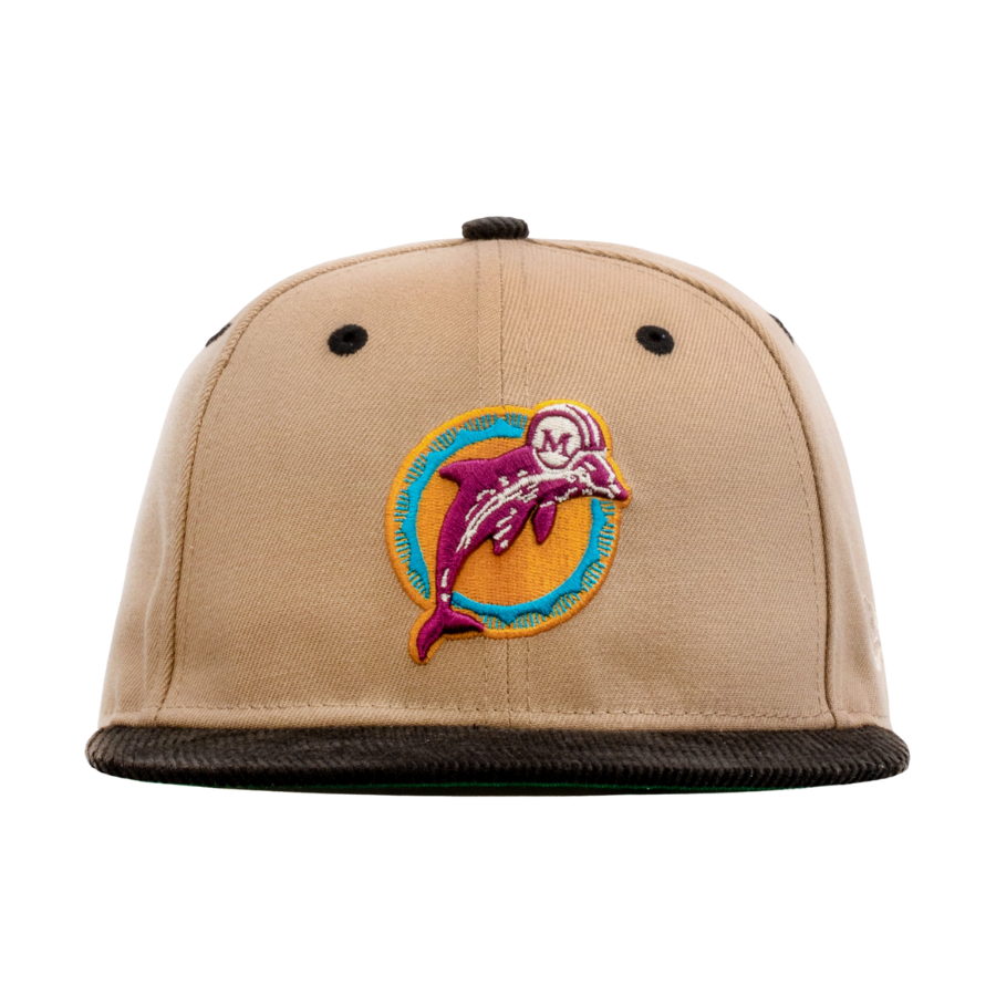 This New Era x SP 'Desert Sky' Miami Dolphins 2023 59FIFTY Fitted Hat was released by Shoe Palace. The fitted has a tan six panel structured high crown and black embroidered eyelets with a black fabric squatchee button. The flat bill of the fitted cap is also black corduroy with a green undervisor and white sweatband. The front panel features the Miami Dolphins logo embroidery. The left panel of the fitted displays the New Era logo and the NFL shield and desert cactus embroidered on the rear crown.