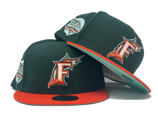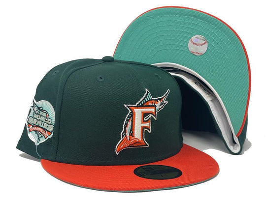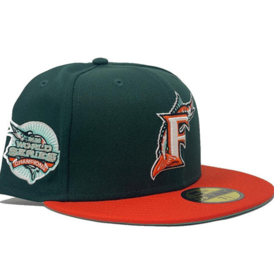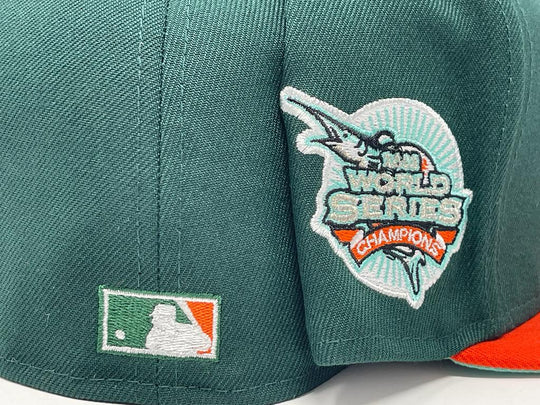 This New Era Florida Marlins 2003 World Series Champions “License Plate" Inspired 59FIFTY fitted hat has a dark green six panel construction with an orange brim and mint undervisor. The front panel includes the Florida Marlins logo embroidered in white and orange stitching. The right panel features a 2003 World Series side patch embroidery. This fitted hat colorway was inspired by the "Sunshine State" (Florida) license plate.