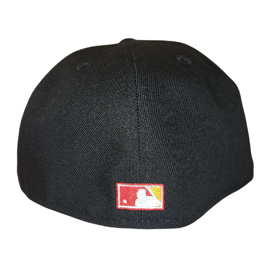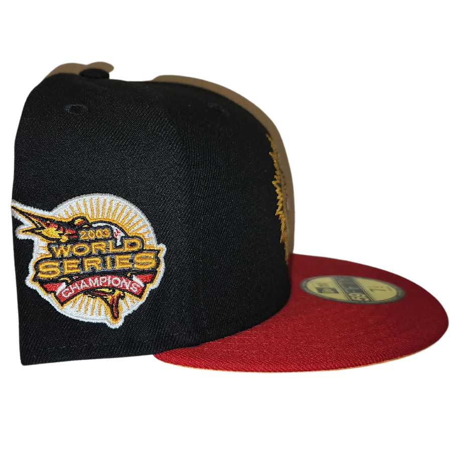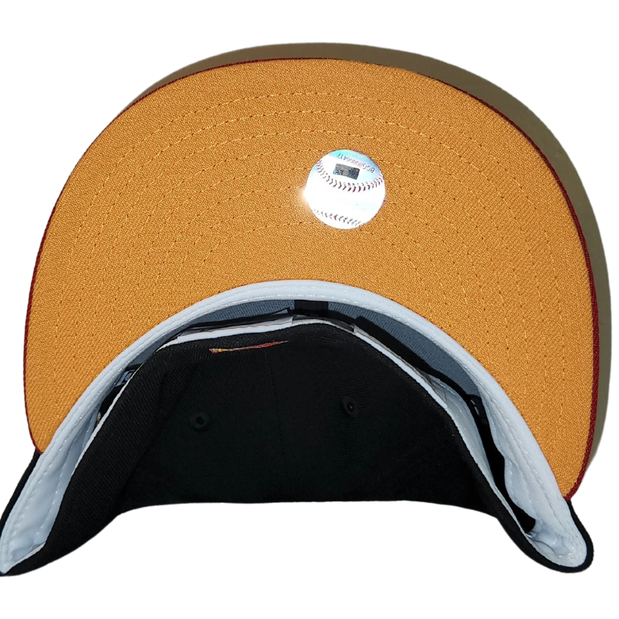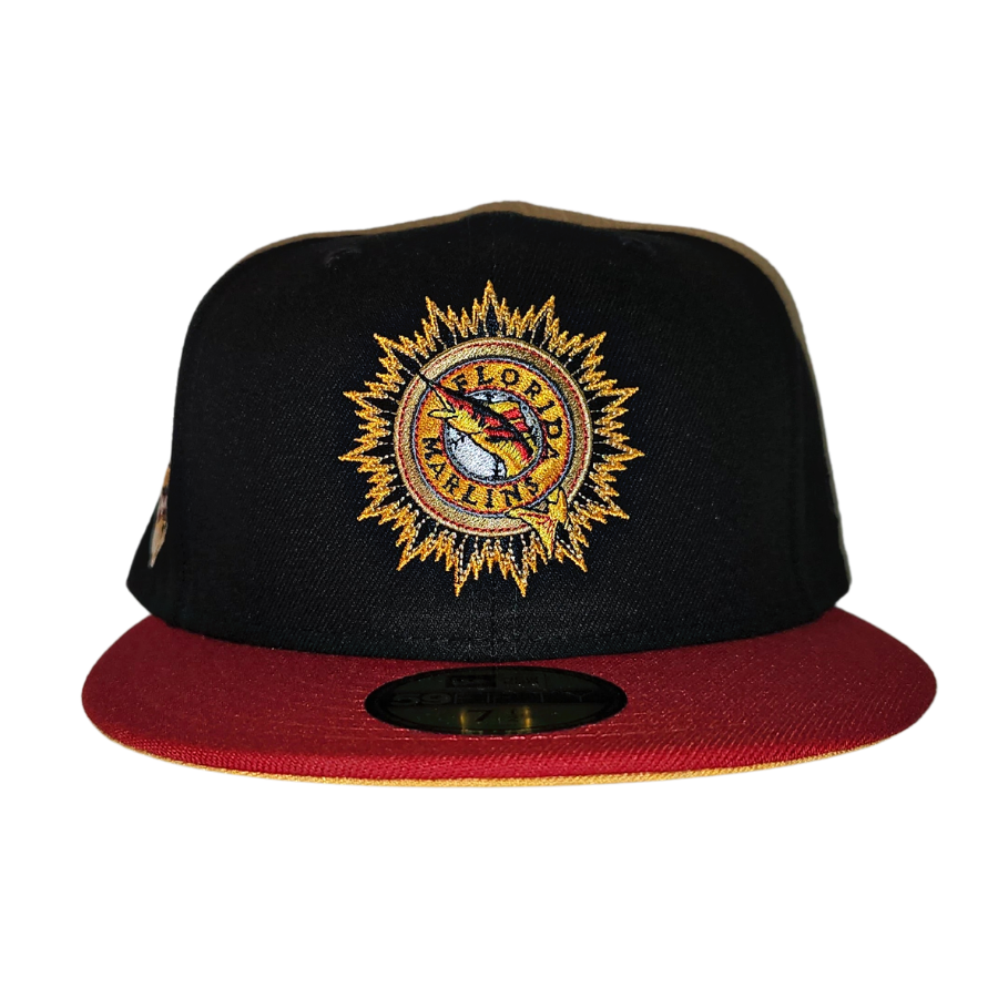 This New Era Florida Marlins 'Citrus Jordan 7s' Inspired 59FIFTY Fitted Hat has a black six panel structured high crown and embroidered eyelets with a black fabric squatchee button. The fitted cap has a burgundy flat bill with an orange undervisor and white sweatband. The front panel features the Florida Marlins logo embroidery and a 2003 World Series side patch embroidery on the right panel. The left panel of the fitted displays the New Era logo and the official MLB logo embroidery on the rear crown.