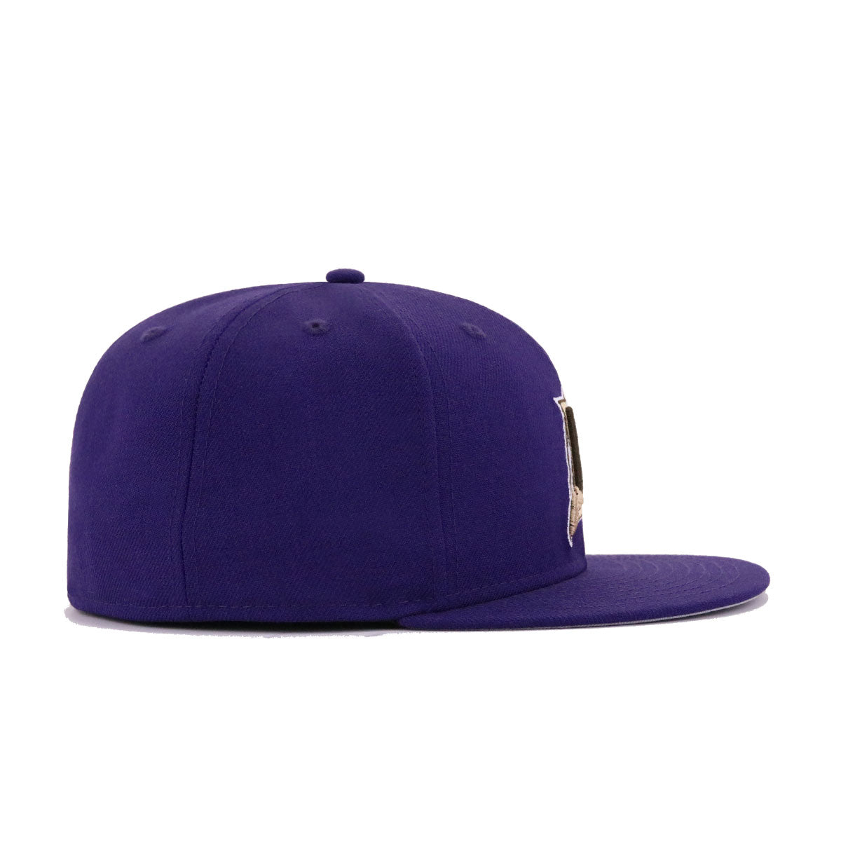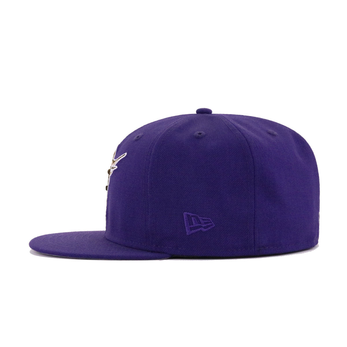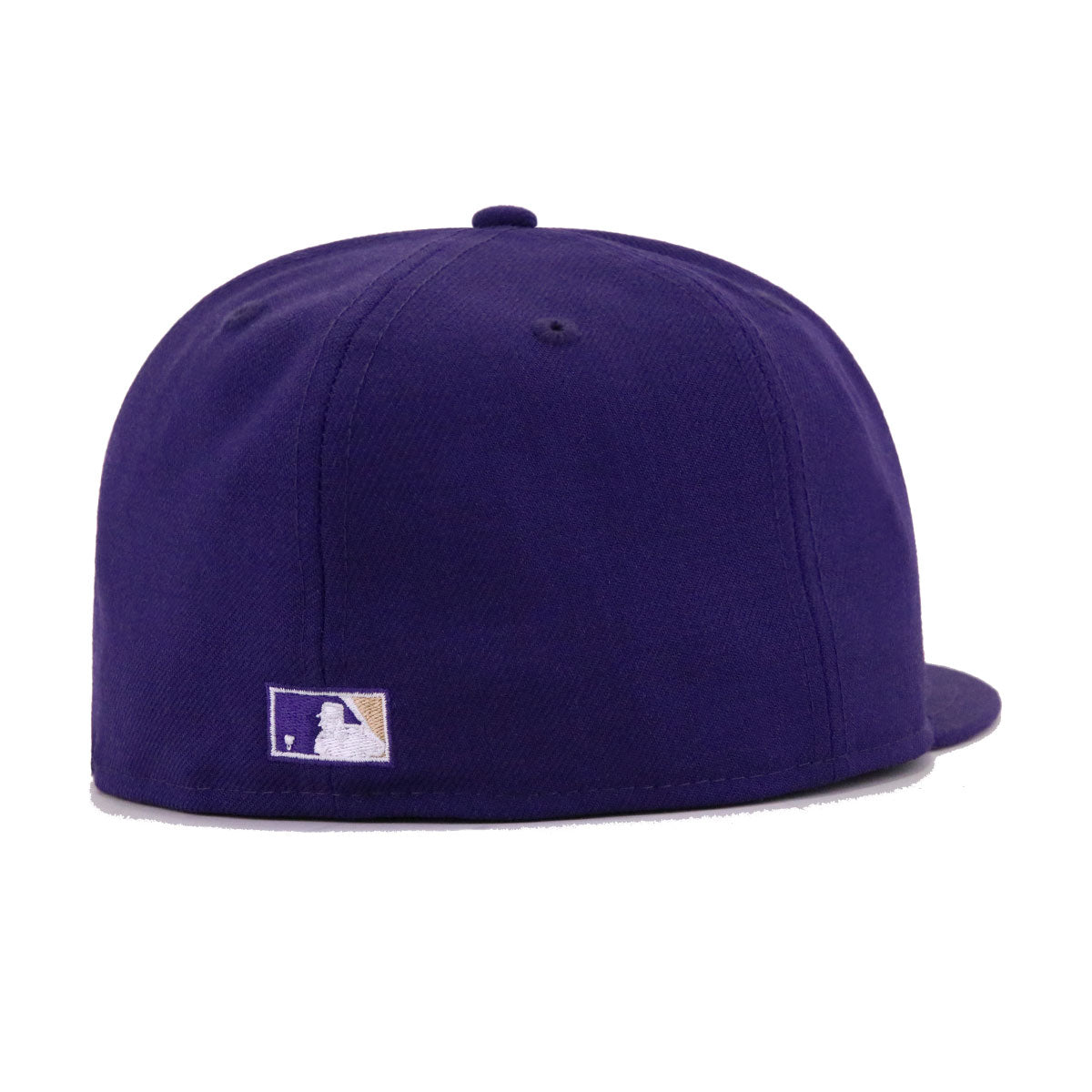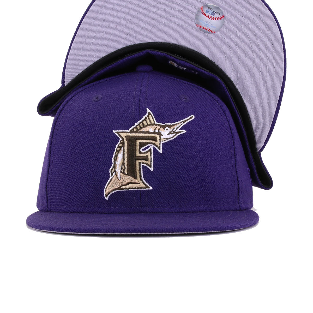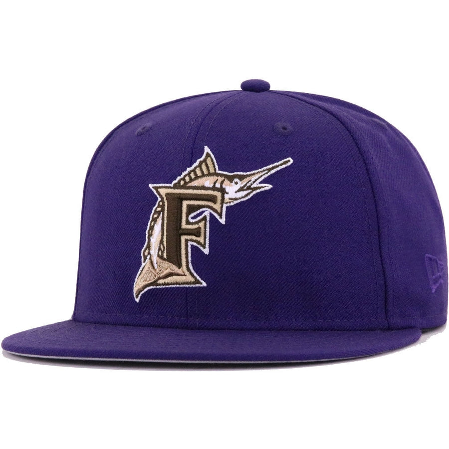 This New Era Florida Marlins Purple 1993 59FIFTY Fitted Hat has a purple six panel structured high crown and embroidered eyelets with a purple fabric squatchee button. The fitted cap has a purple flat bill with a grey undervisor and black sweatband. The front panel features the Florida Marlins logo embroidery. The left panel of the fitted displays the New Era logo and the official MLB logo embroidery on the rear crown.