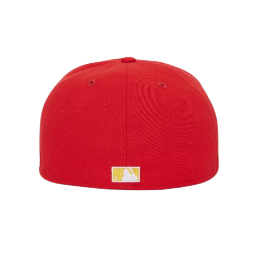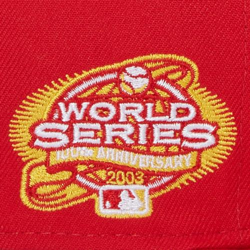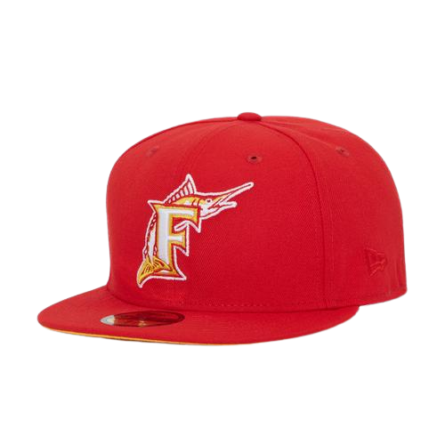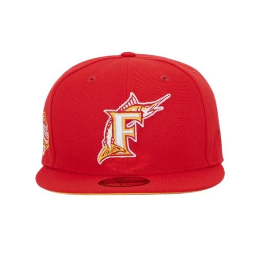 This New Era Florida Marlins Red/Yellow "Flash" 59FIFTY Fitted Hat has a red six panel structured high crown and embroidered eyelets with a red fabric squatchee button. The fitted cap has a red flat bill with a yellow undervisor and white sweatband. The front panel features the Florida Marlins logo embroidery and a 2003 World Series side patch on the right panel. The left panel of the fitted displays the New Era logo and the official MLB logo embroidery on the rear crown.