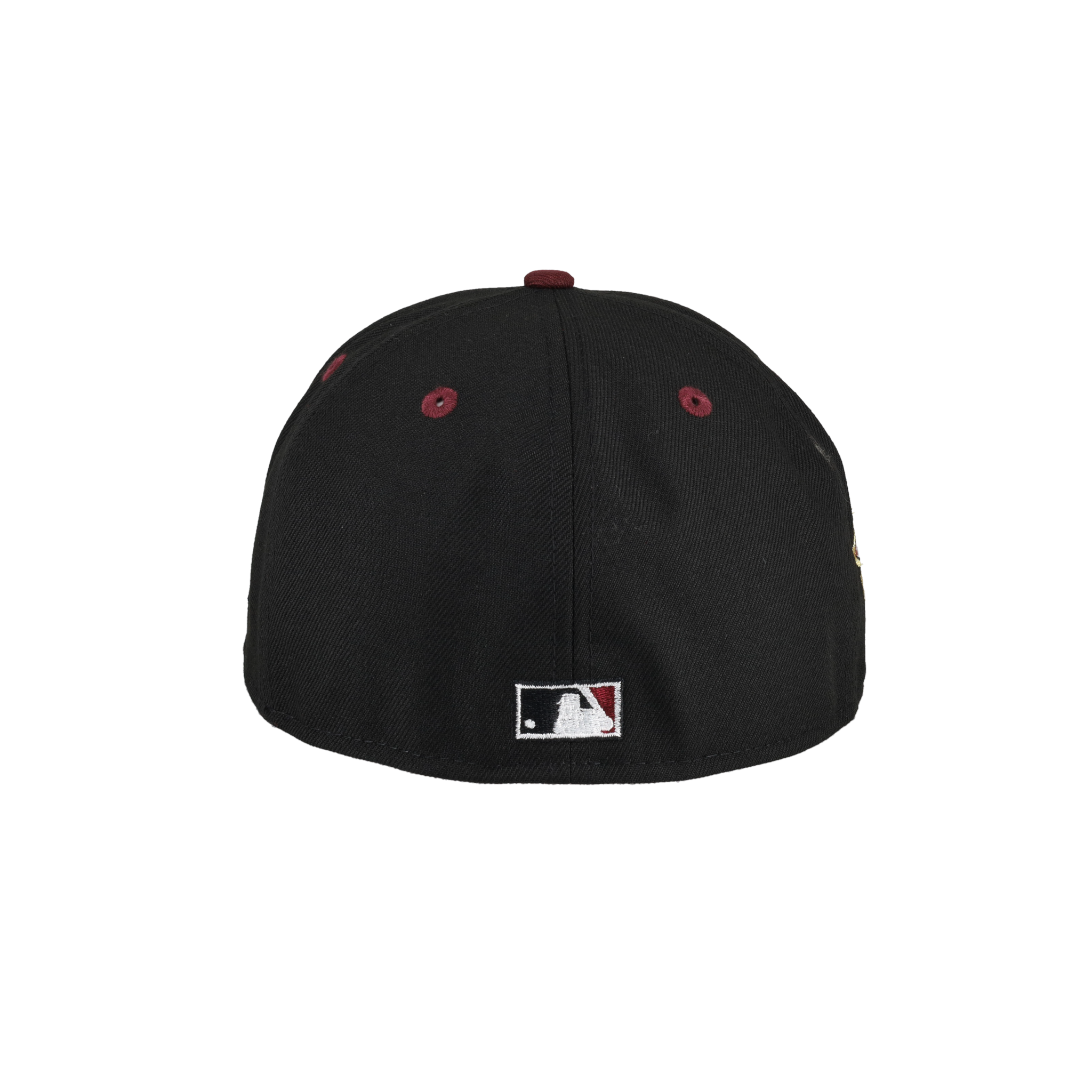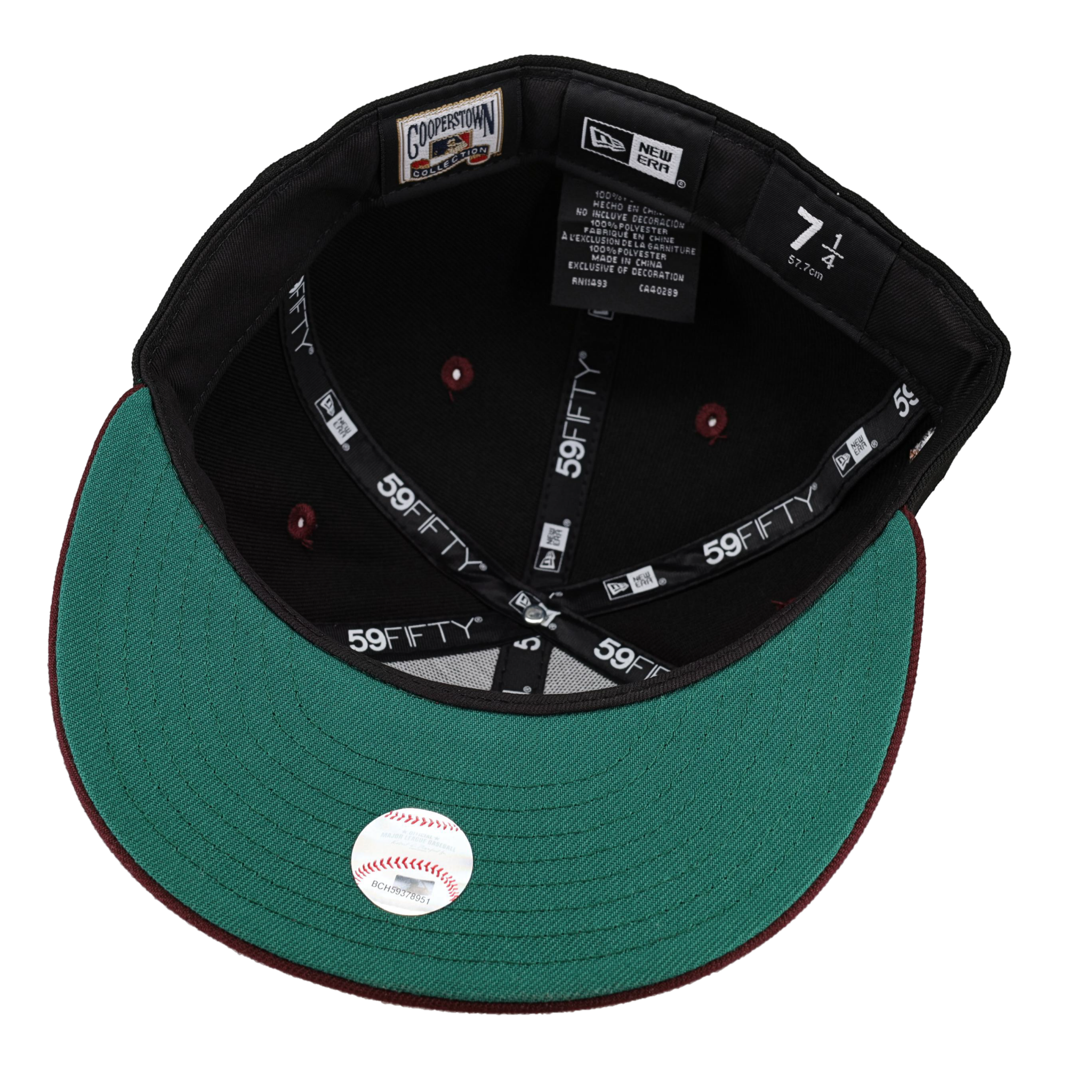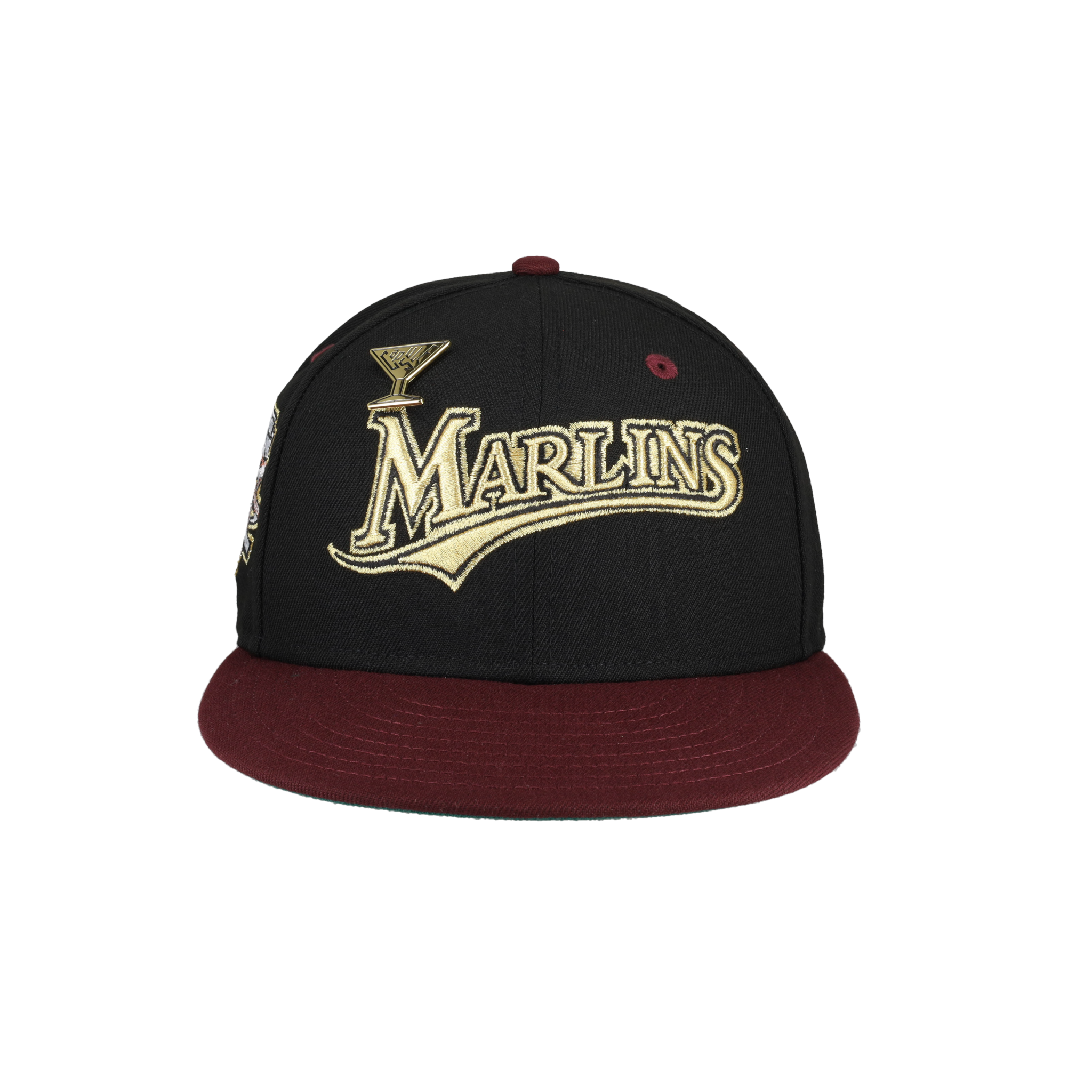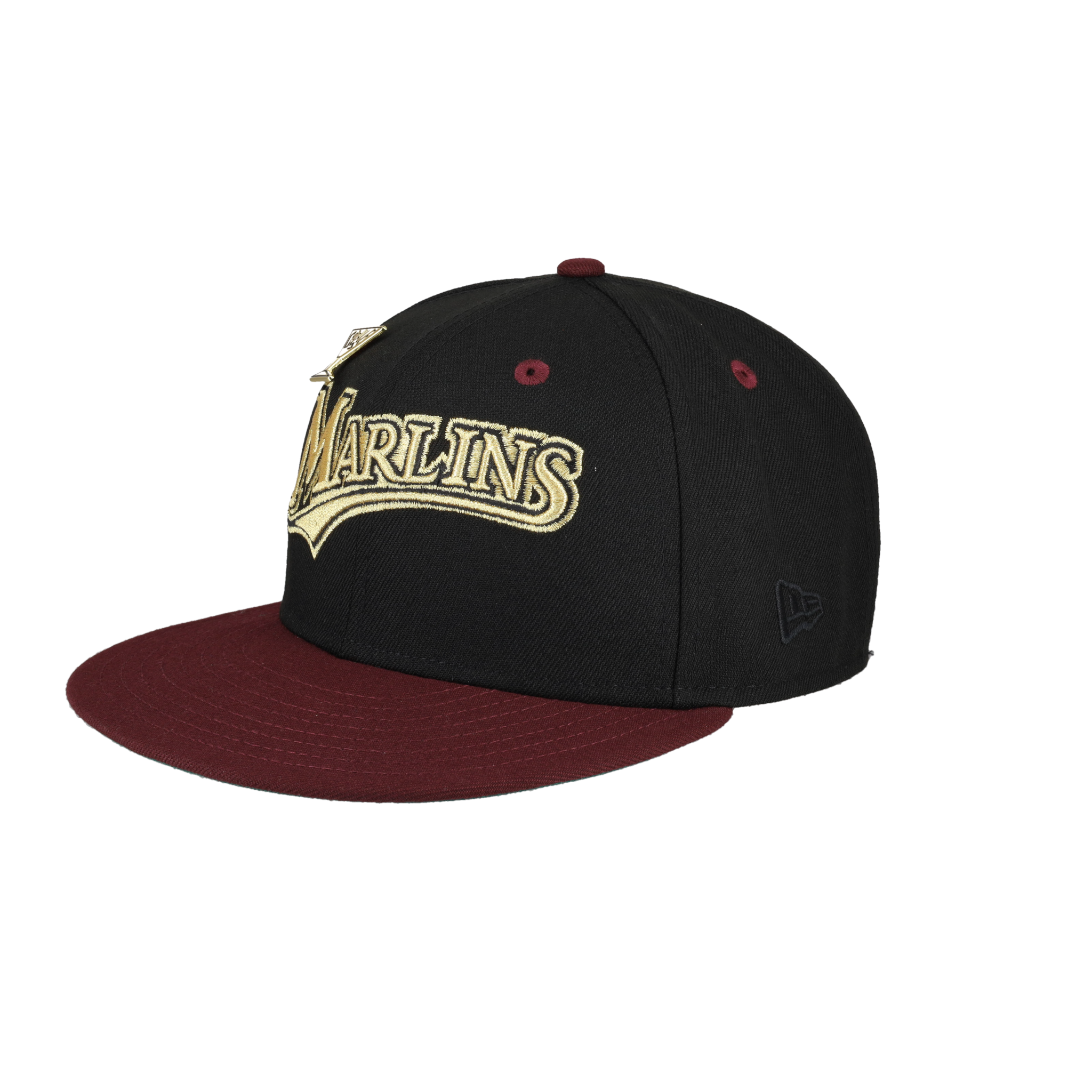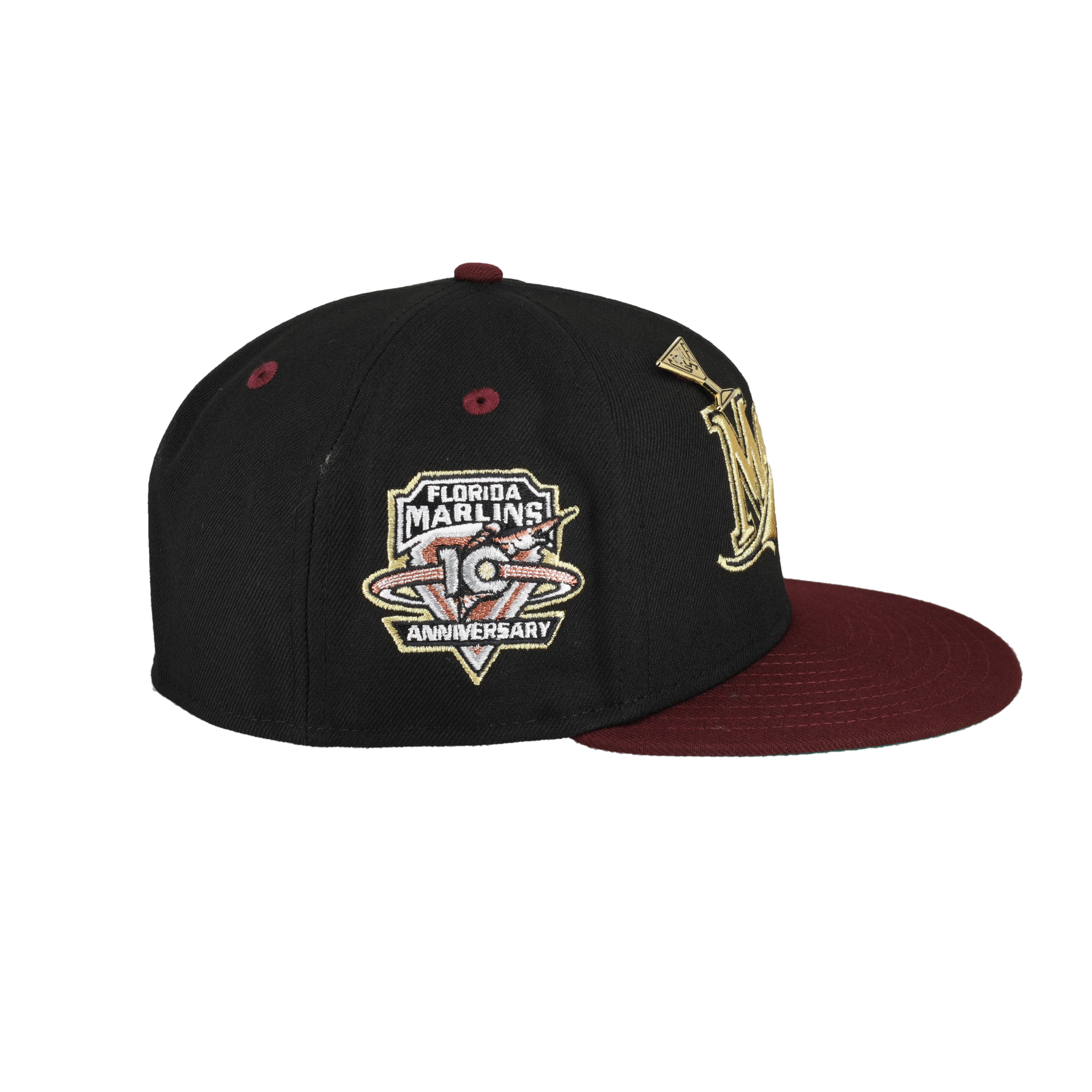 This Florida Marlins fitted hat was released by Capsule. The fitted has a black six panel structured high crown, maroon embroidered eyelets with a maroon fabric squatchee button. The flat bill of the cap is also maroon with a dark green undervisor and black sweatband. The front panel features the Florida Marlins logo embroidered in gold stitching and a 10th Anniversary side patch embroidery on the right panel. The left panel of the fitted displays the New Era logo and the official MLB Batterman logo embroidery on the rear crown.