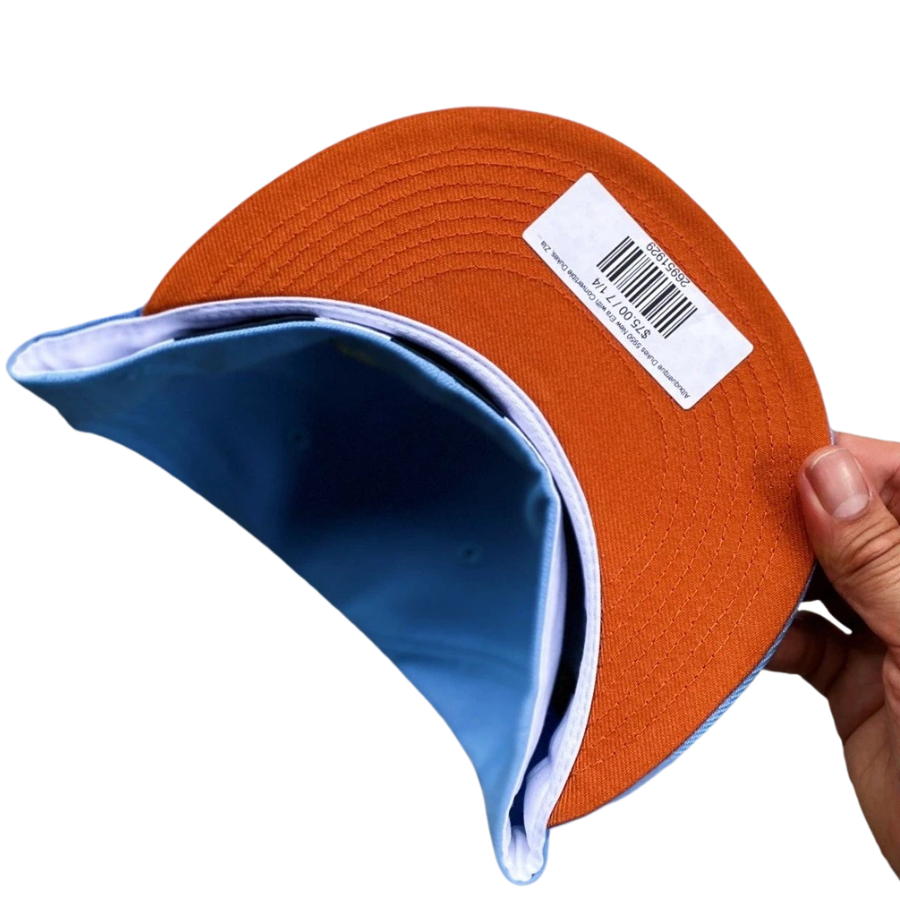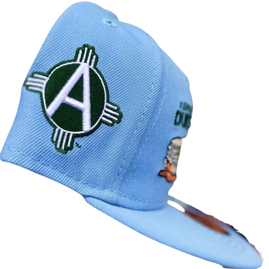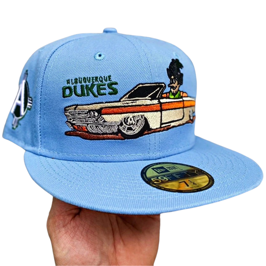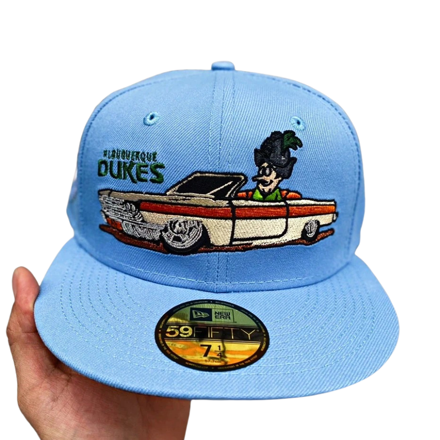 This New Era Albuquerque Dukes 'Breaking Bad' fitted hat is a My Fitteds exclusive release. The 59FIFTY fitted hat has a light blue six panel structured high crown, embroidered eyelets and fabric squatchee button. The flat bill of the fitted cap is also light blue with a rust orange undervisor and white sweatband. The front panel and right panel features the Albuquerque Dukes logo embroidery.