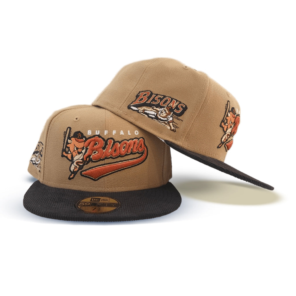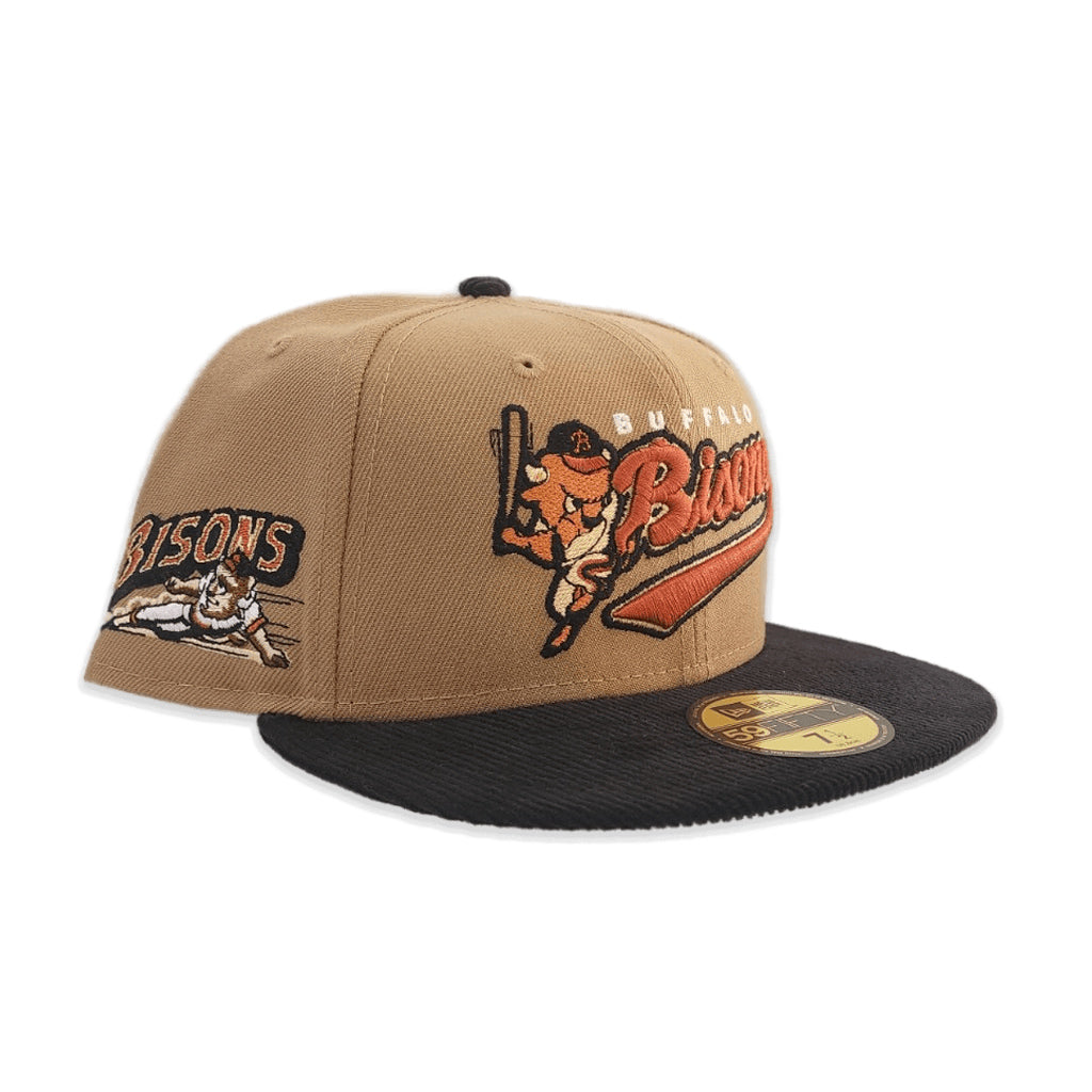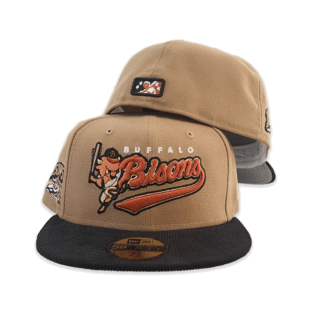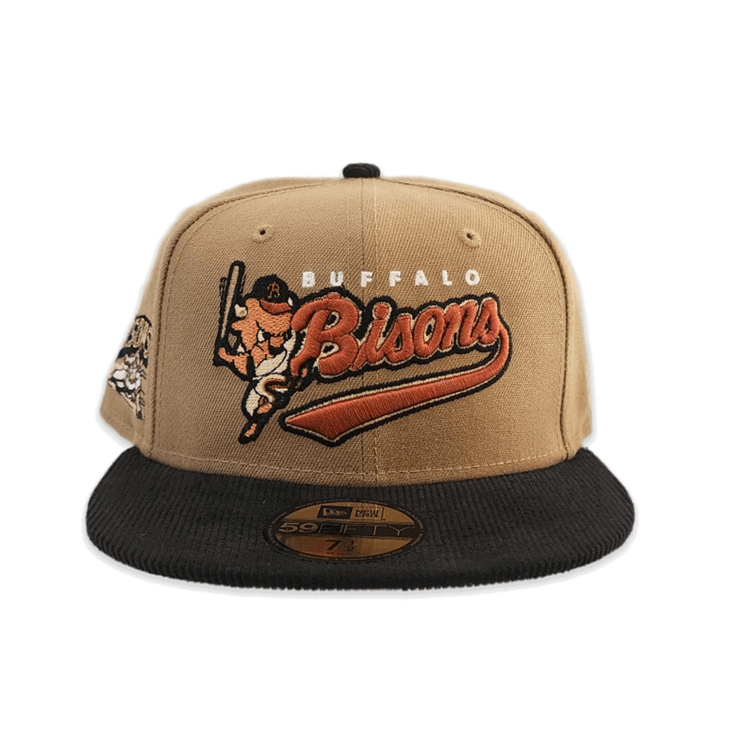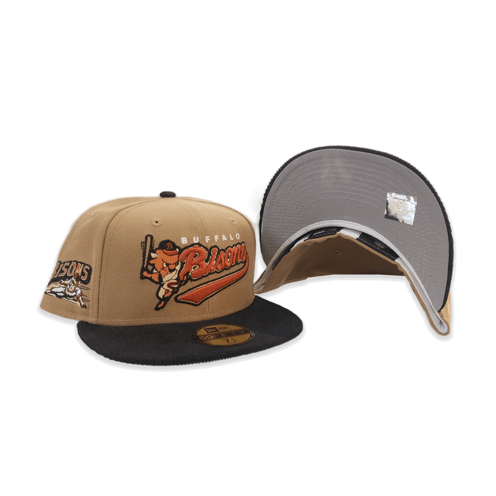 This New Era Buffalo Bisons Khaki/Black Corduroy 59FIFTY Fitted Hat has a khaki six panel structured high crown and embroidered eyelets with a black fabric squatchee button. The fitted cap also has a black corduroy flat bill with a grey undervisor and white sweatband. The front panel features the Buffalo Bisons logo embroidery and a side patch embroidery on the right panel. The left panel of the fitted displays the New Era logo and the official MiLB Batterman embroidery on the rear crown.