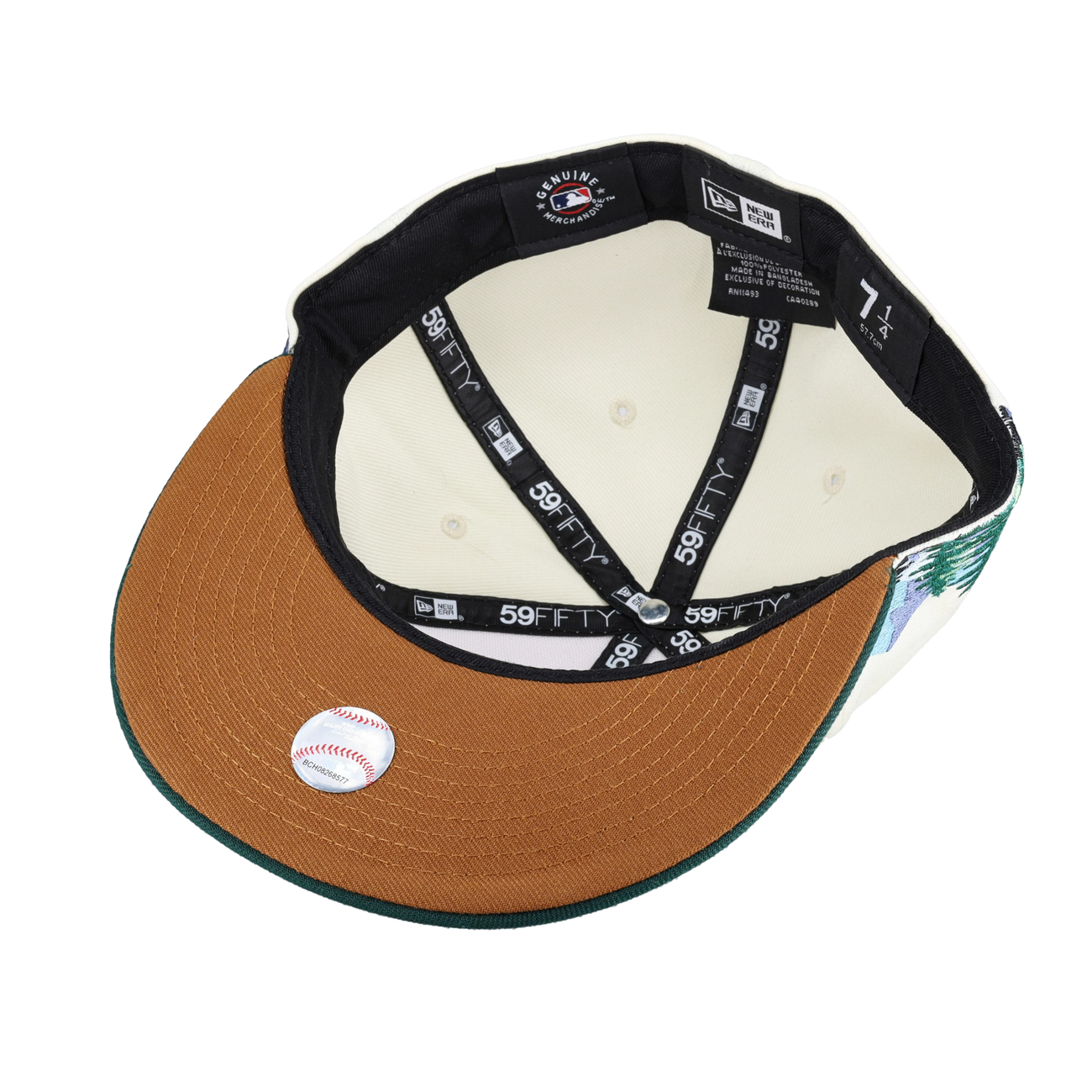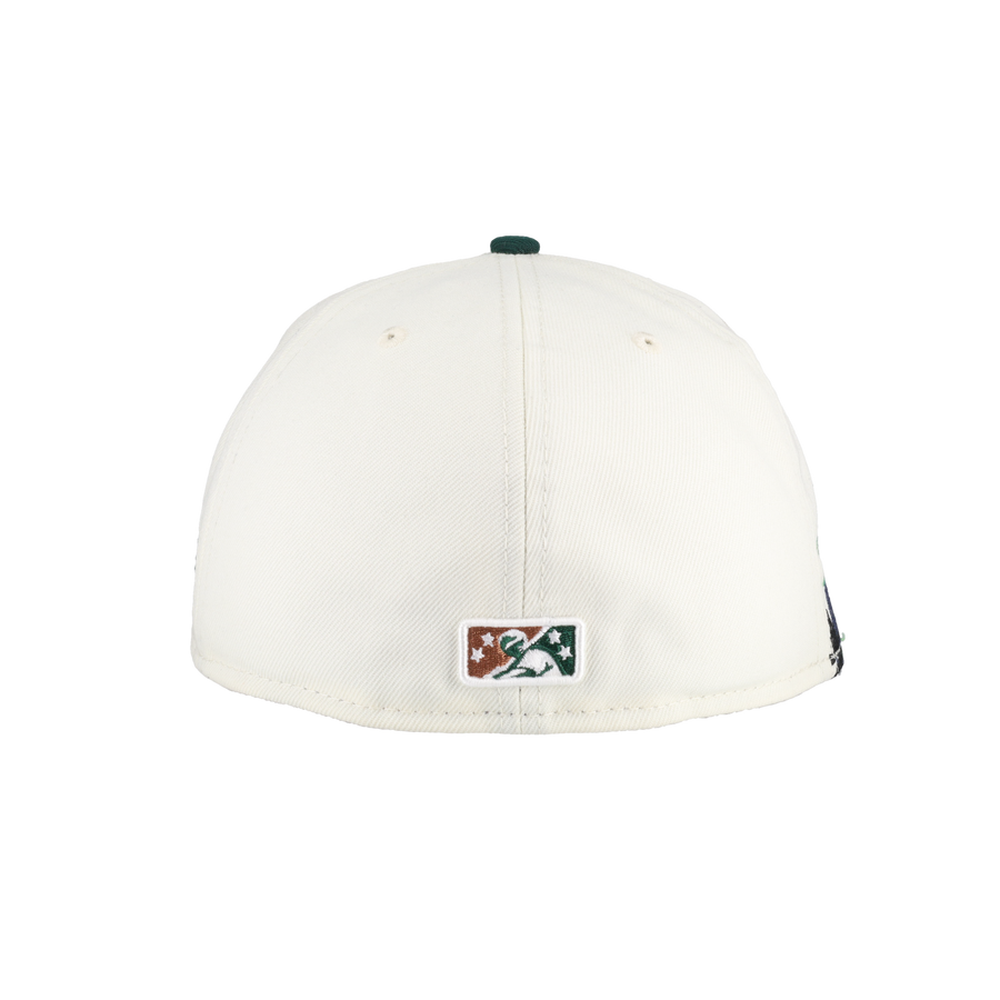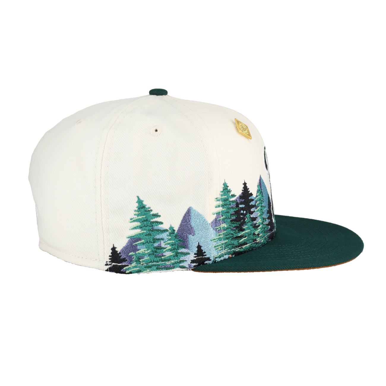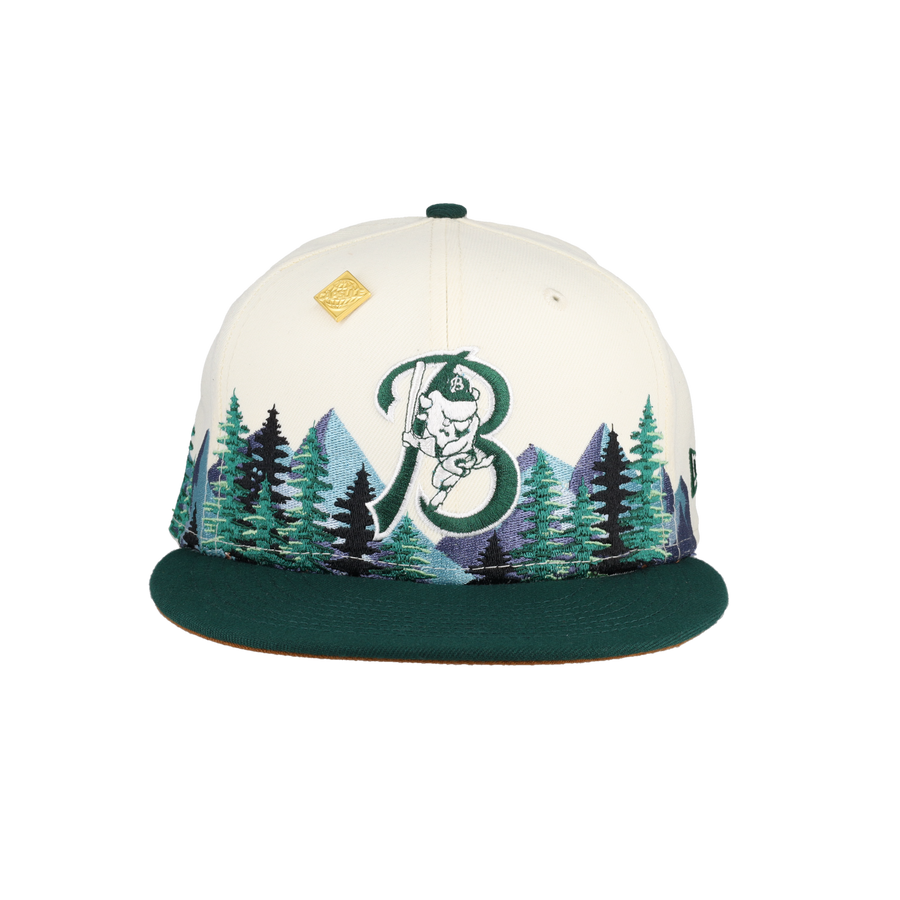 The Buffalo Bisons Outdoor 59FIFTY Fitted Cap features an embroidered mountain landscape and Bisons logo at the front panels with a matching MLB Batterman logo at the rear. Additional details include a brown undervisor.