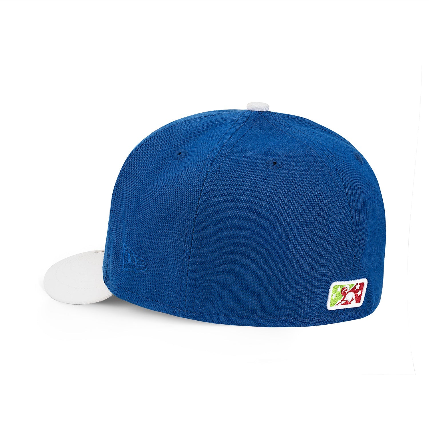This New Era Buffalo Bisons Royal Blue/White 25th Anniversary 59FIFTY Fitted Hat was released by Cap USA NYC. The fitted has a royal blue six panel structured high crown and embroidered eyelets with a white fabric squatchee button. The flat bill of the fitted cap is also white. The front panel features the Buffalo Bisons logo embroidery and a side patch embroidered on the right panel. The left panel of the fitted displays the New Era logo and the official MiLB embroidered on the rear crown.