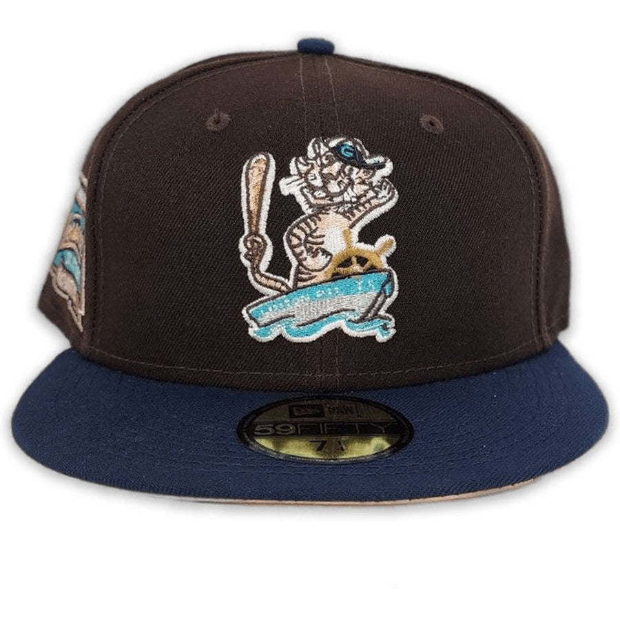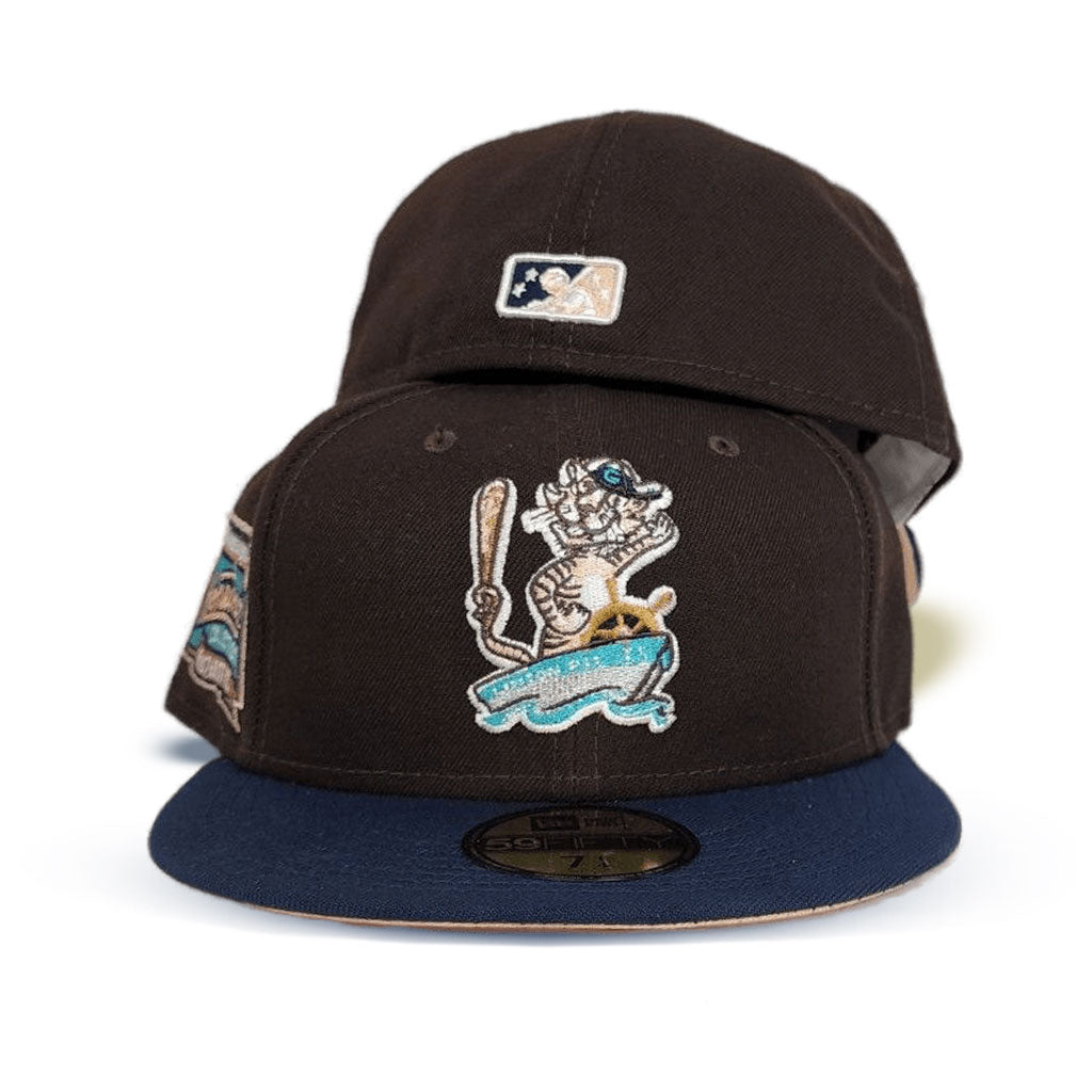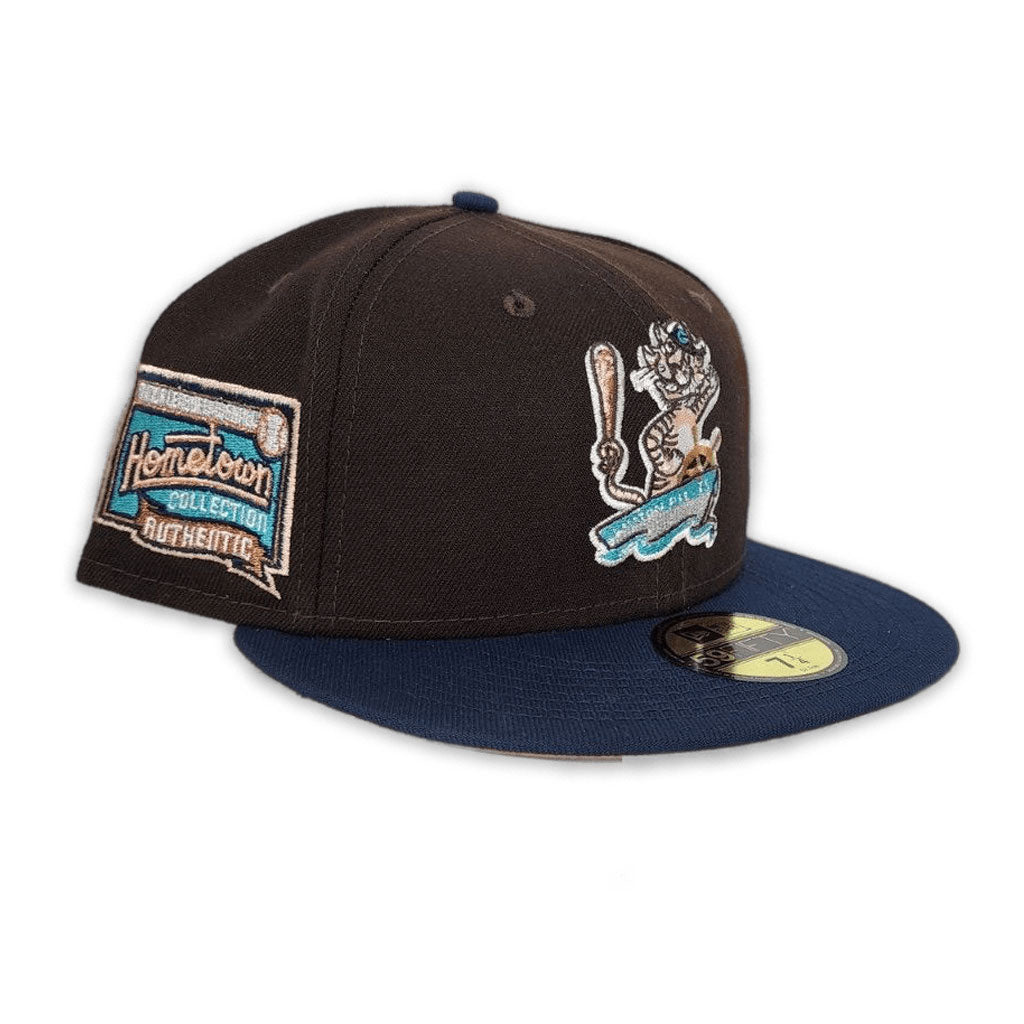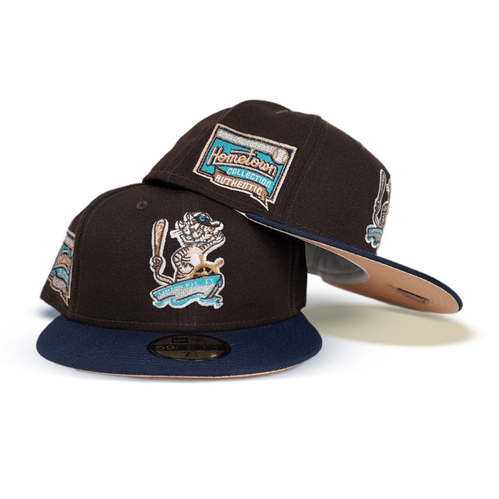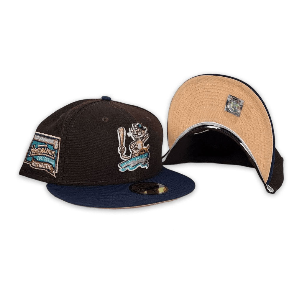 This New Era Clinton Pilots Brown/Navy Blue Hometown Collection 59FIFTY Fitted Hat has a dark brown six panel structured high crown and embroidered eyelets with a navy fabric squatchee button. The fitted cap has a navy blue flat bill with a peach undervisor and white sweatband. The front panel features the Clinton Pilots logo embroidery and a Hometown Collection side patch embroidery on the right panel. The left panel of the fitted displays the New Era logo and the official MILB logo embroidery on the rear crown.