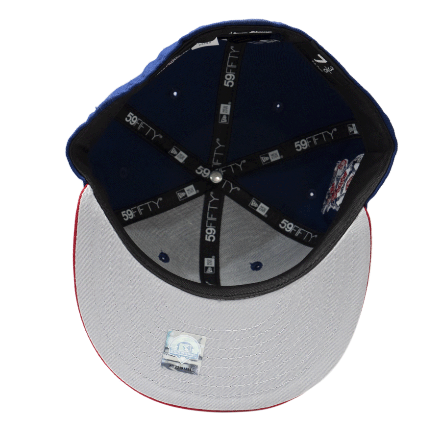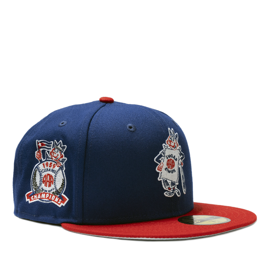 This Havana Sugar Kings fitted hat was released by Cool J's. The fitted has a navy blue six panel structured high crown and embroidered eyelets with a red fabric squatchee button. The flat bill of the cap is red with a gray undervisor and black sweatband. The front panel features the Havana Sugar Kings logo embroidery and a 1959 Champions side patch embroidery on the right panel.