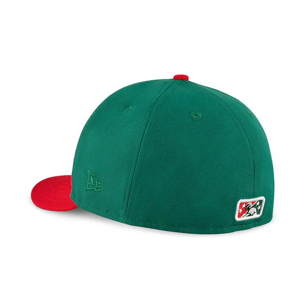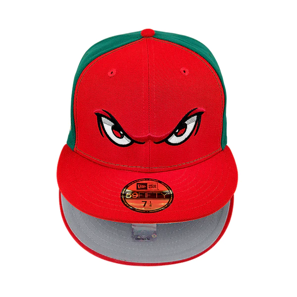 This Lake Elsinore Storm fitted hat was released by Cap USA NYC. The fitted has a two tone red and green six panel structured high crown and embroidered eyelets with a red fabric squatchee button. The fitted cap also has a red flat bill and a grey bottom under brim. The front panel features a Lake Elsinore Storm eyes logo embroidery a California League side patch on the right panel.