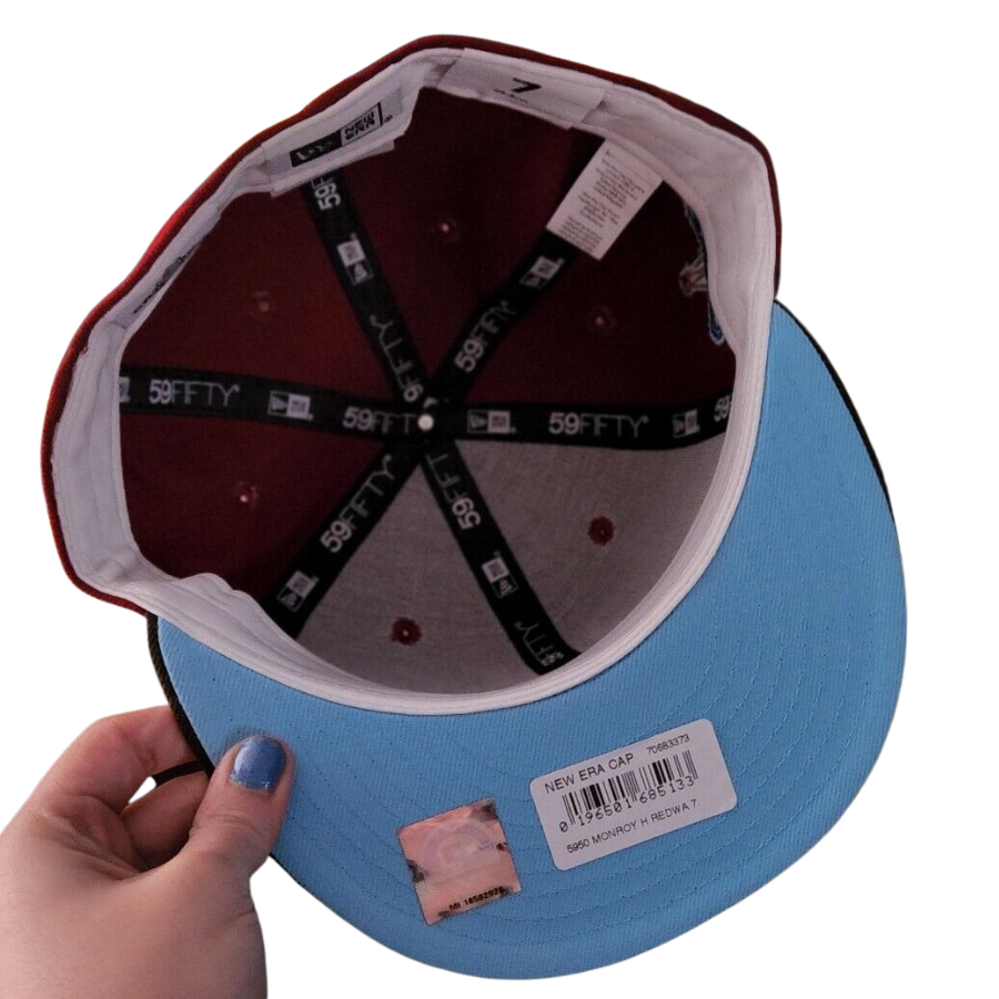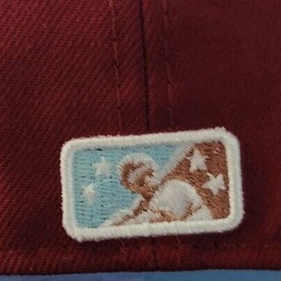 This New Era Montreal Royals 59FIFTY fitted hat as a burgundy six panel structured high crown and embroidered eyelets with a mocha fabric squatchee button and flat bill. The undervisor of the fitted is icy baby blue with a white sweatband. The front panel features the Montreal Royals logo embroidered in copper thread with a side patch embroidery on the right panel.