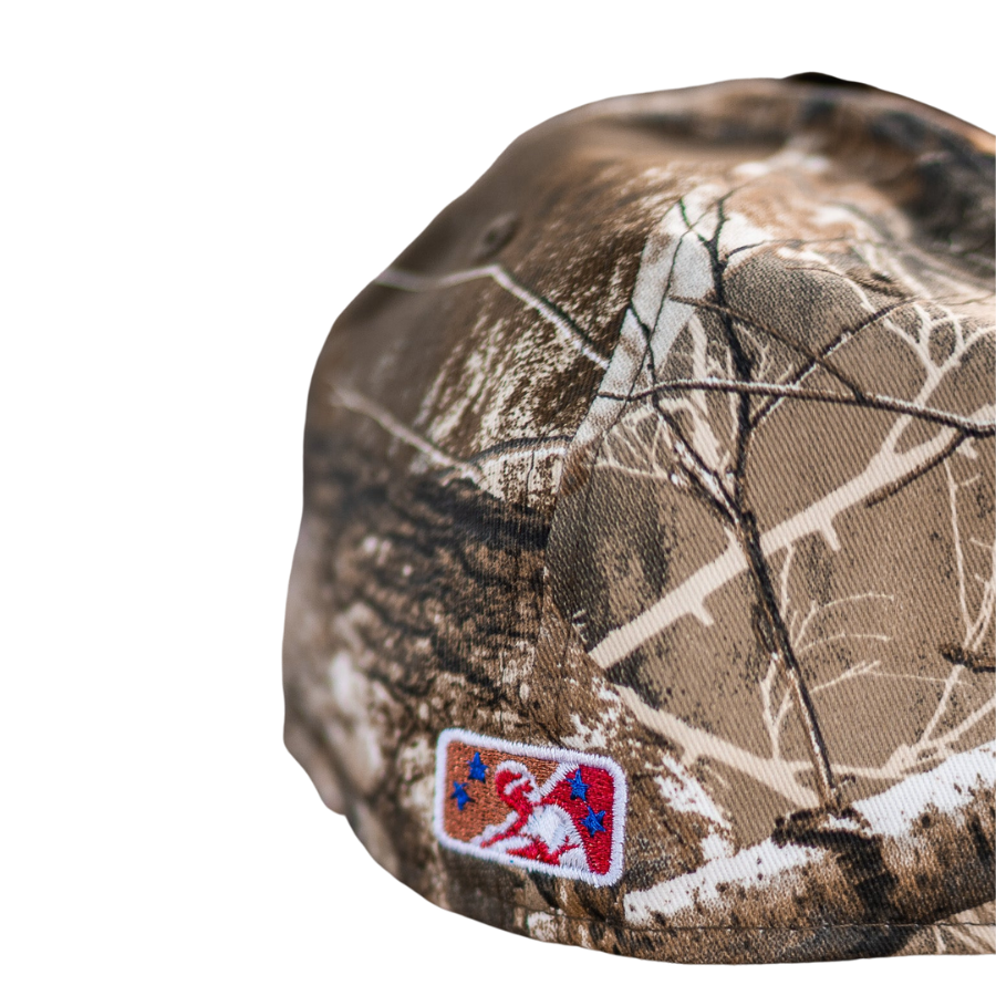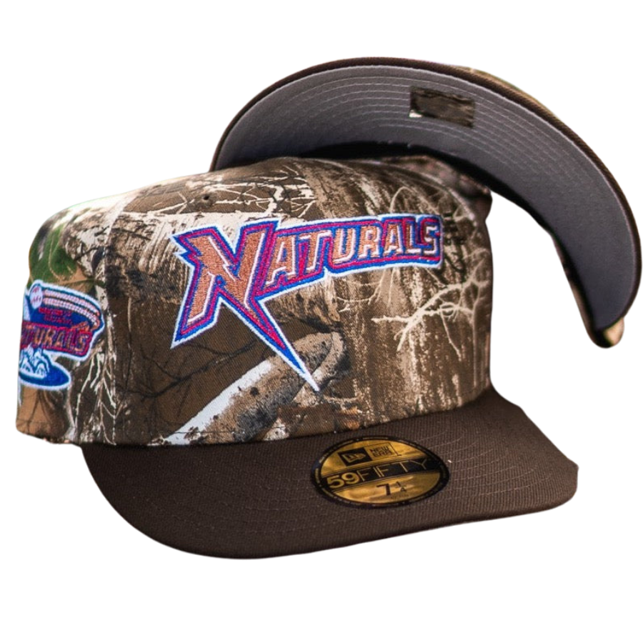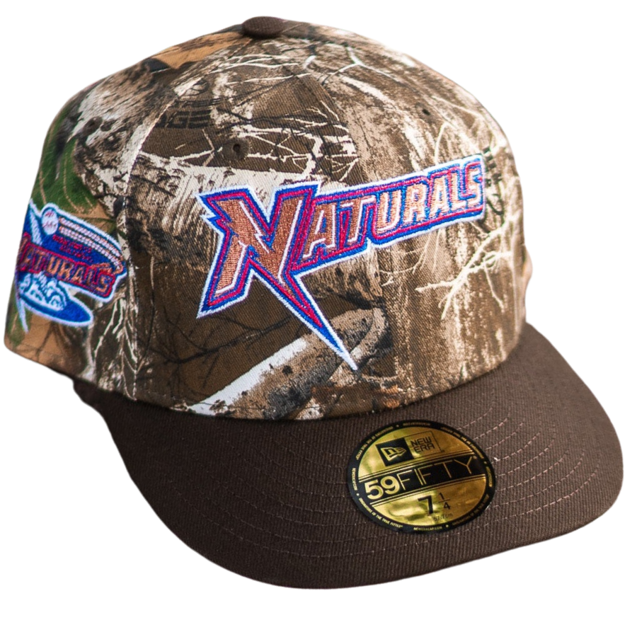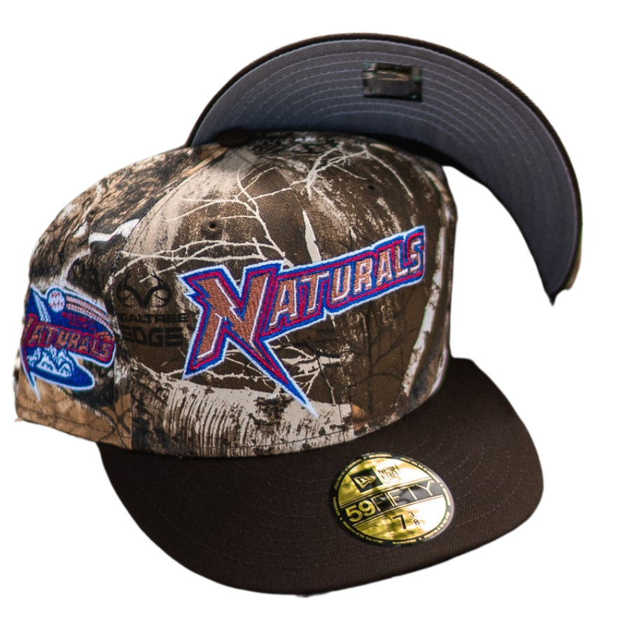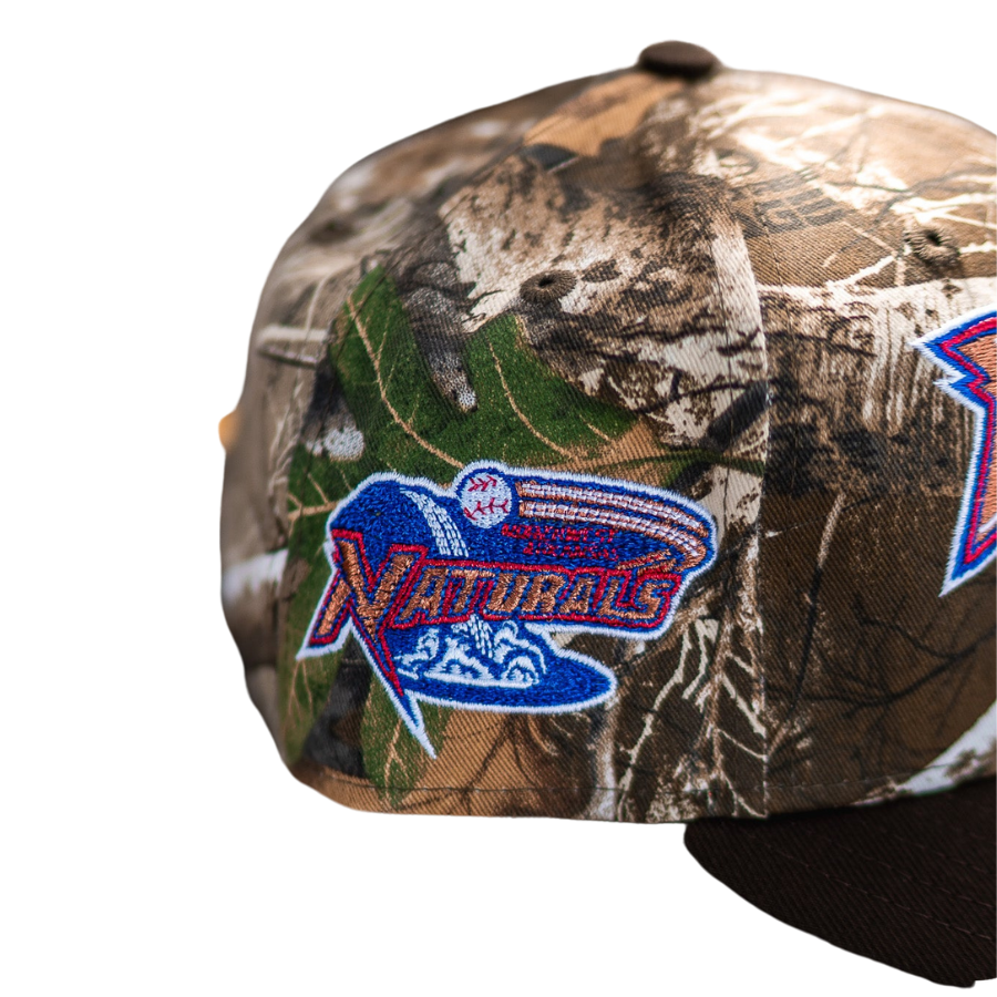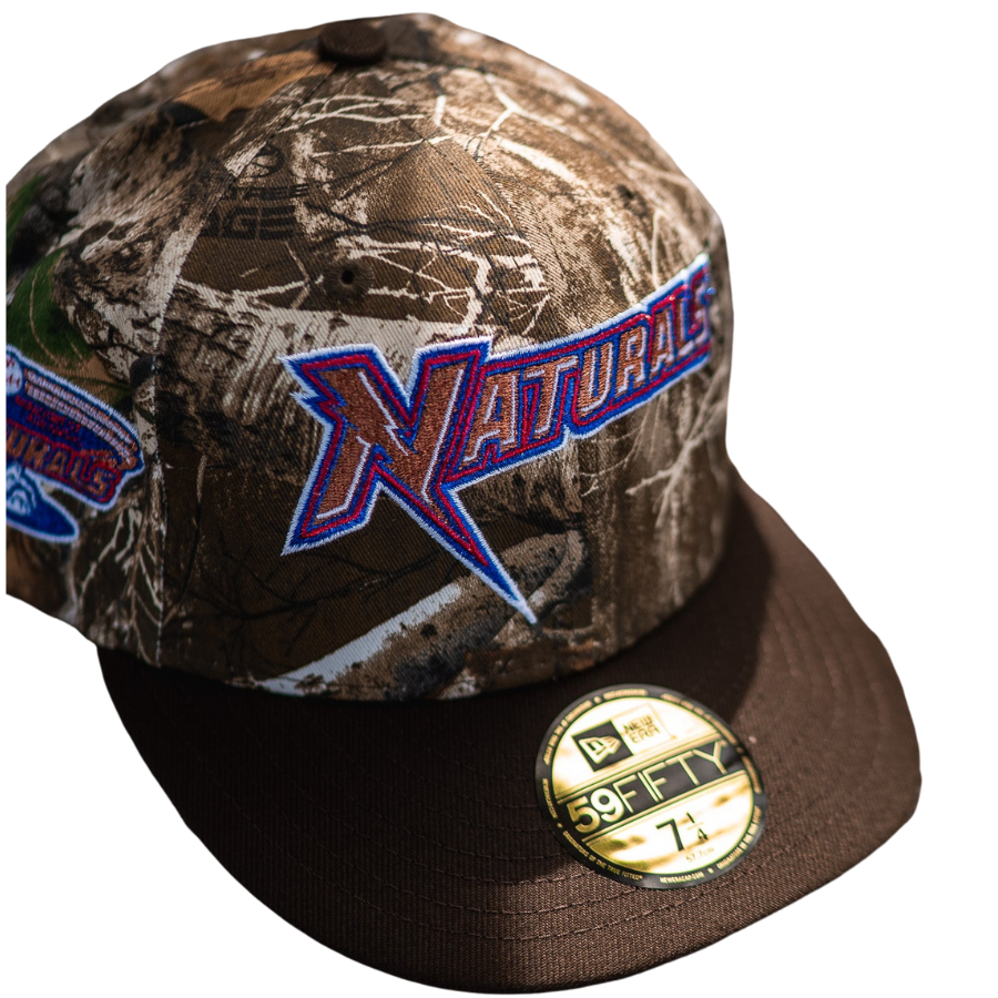 This Northwest Arkansas Naturals fitted hat was released by Sneaker Town. The fitted has a realtree six panel structured high crown and embroidered eyelets with a mocha brown fabric squatchee button. The flat bill of the cap is mocha brown with a grey undervisor. The front panel features the Northwest Arkansas Naturals logo embroidery and the team side patch on the right panel. The left panel of the fitted displays the New Era logo and the official MiLB Batterman logo embroidery on the rear crown.