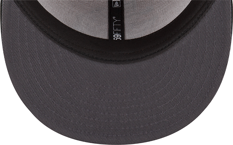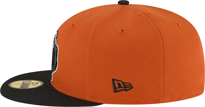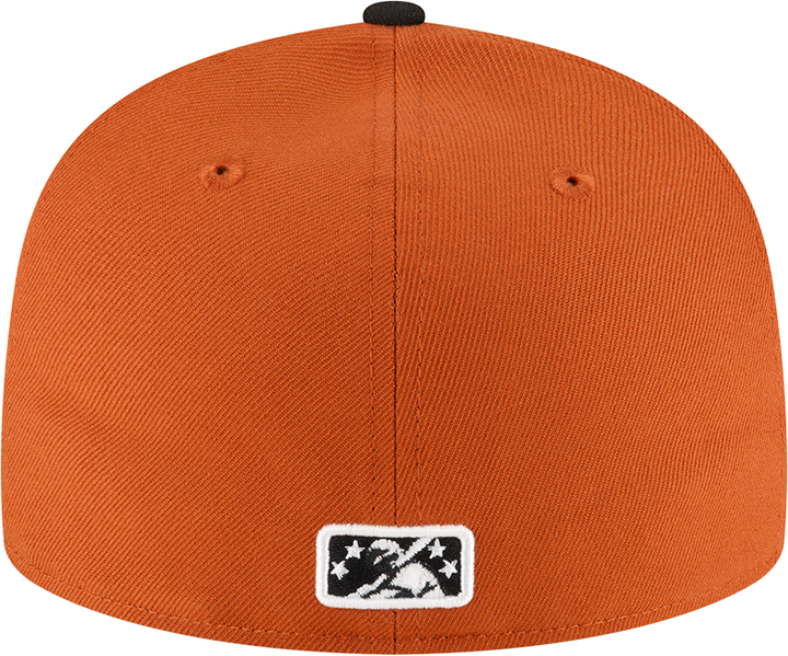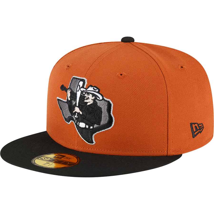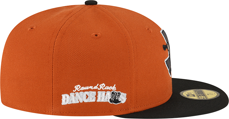 This Round Rock Express fitted has a rust orange six panel structured high crown and embroidered eyelets with a black fabric squatchee button. The fitted cap also has a black flat bill with a graphite undervisor and black sweatband. The front panel features the Round Rock Express logo embroidery and a Round Rock Dancehalls embroidery on the right panel. The left panel of the fitted displays the New Era logo and the official MiLB Batterman logo embroidery on the rear crown.