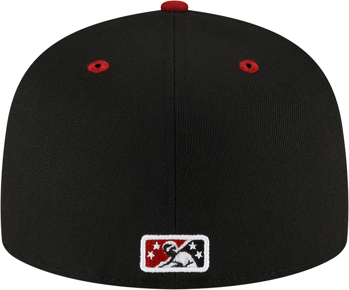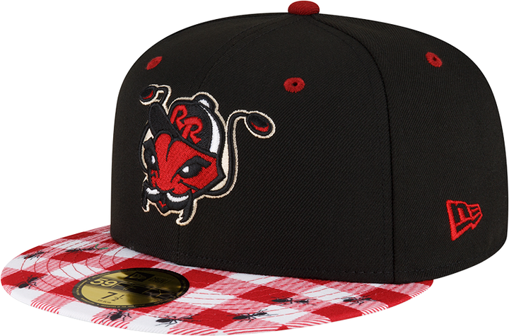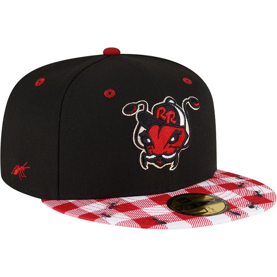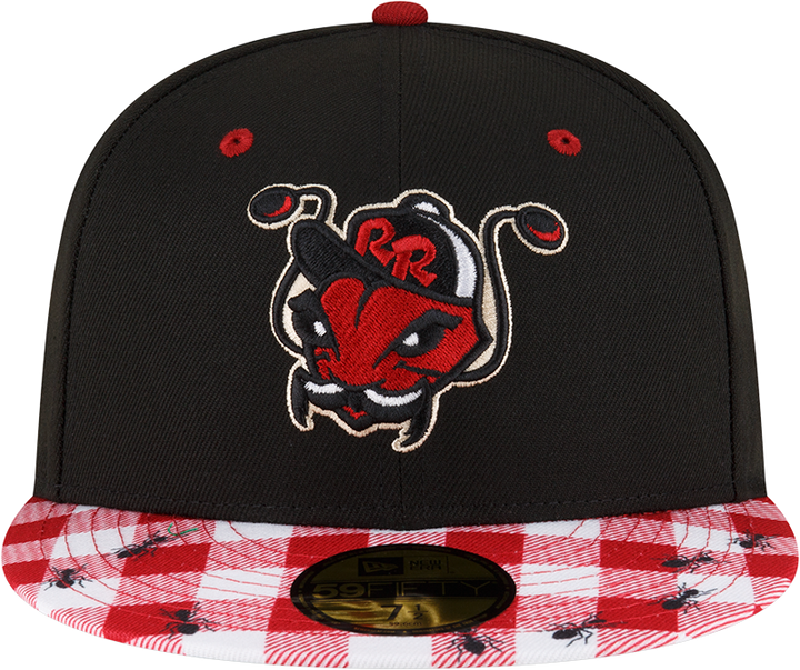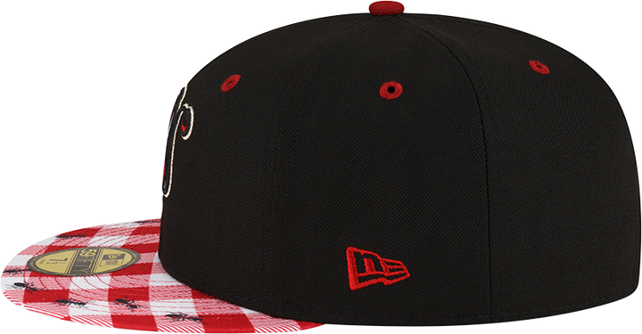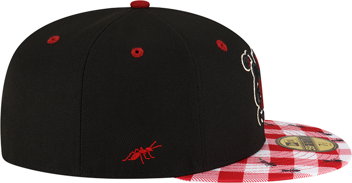 This Round Rock Express Fire Ant Picnic Blanket fitted has a black six panel structured high crown with red embroidered eyelets and fabric squatchee button. The fitted cap also has a picnic blanket flat bill with fire ants crawling over it. The front panel features the Round Rock Express Fire Ant logo embroidery. The left panel of the fitted displays the New Era logo and the official MiLB Batterman logo embroidery on the rear crown.