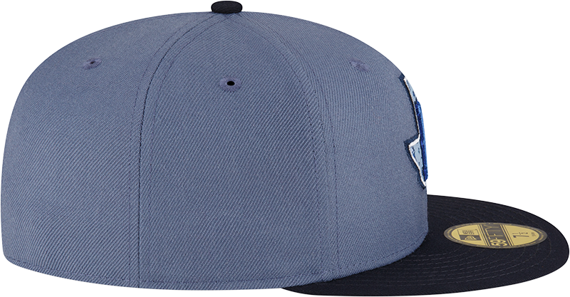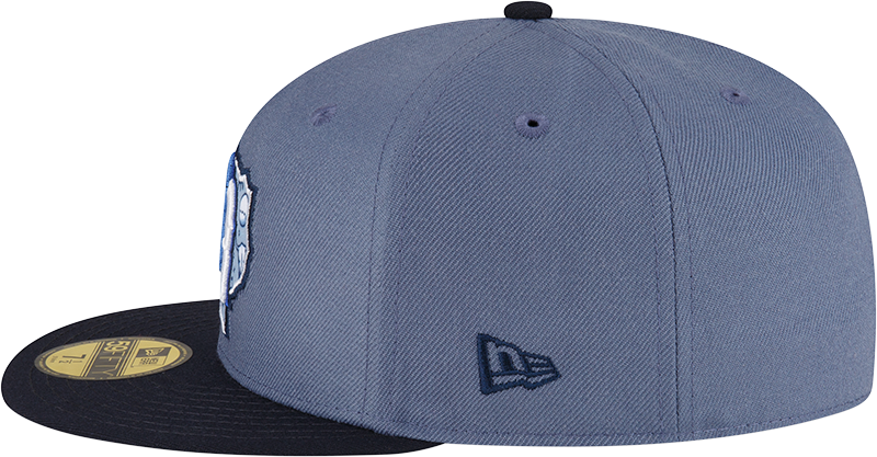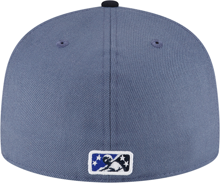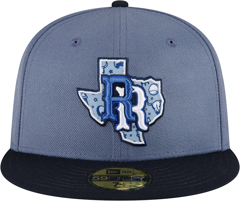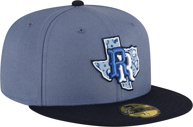 This Round Rock Express fitted has a pearl blue six panel structured high crown and embroidered eyelets with a navy blue fabric squatchee button. The fitted cap also has a navy blue flat bill with a unique sky & royal blue texas graphic undervisor and white sweatband. The front panel features the Round Rock Express logo embroidery. The left panel of the fitted displays the New Era logo and the official MiLB Batterman logo embroidery on the rear crown.