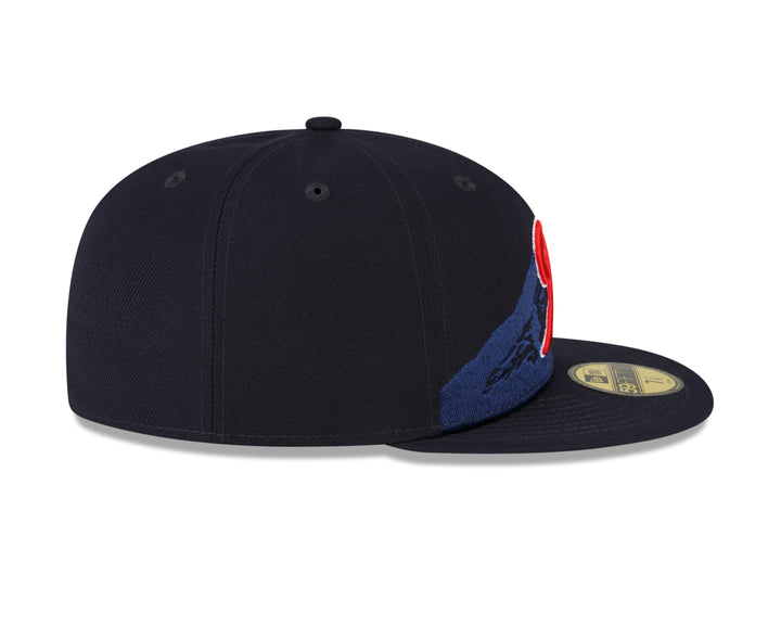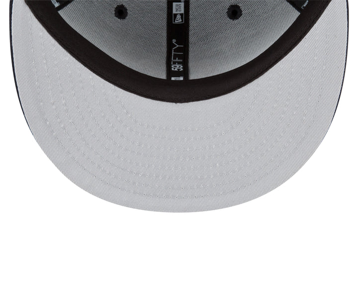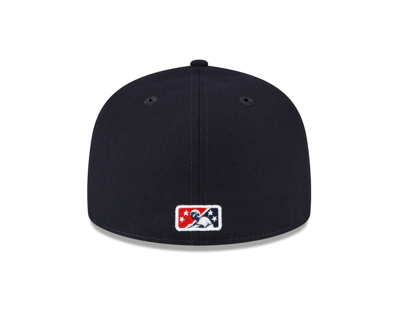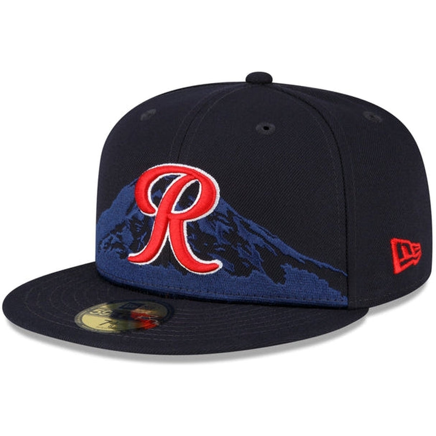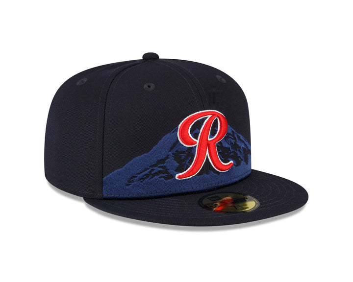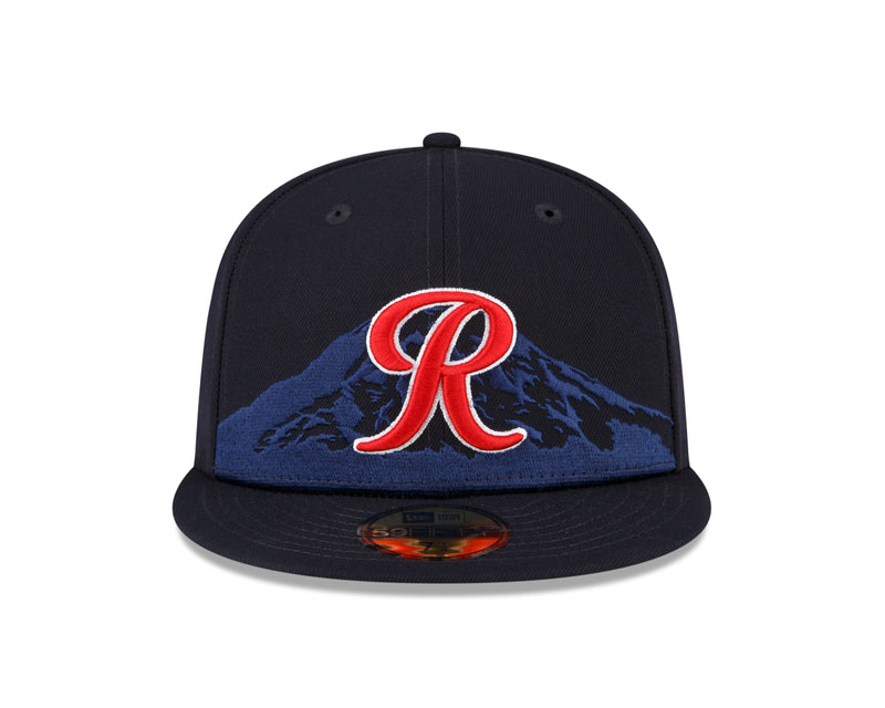 This Tacoma Rainiers fitted has a navy six panel structured high crown and embroidered eyelets with a navy fabric squatchee button. The fitted cap also has a navy flat bill with a gray undervisor and black sweatband. The front panel features the Tacoma Rainiers logo embroidery. The left panel of the fitted displays the New Era logo and the official MiLB Batterman logo embroidery on the rear crown.