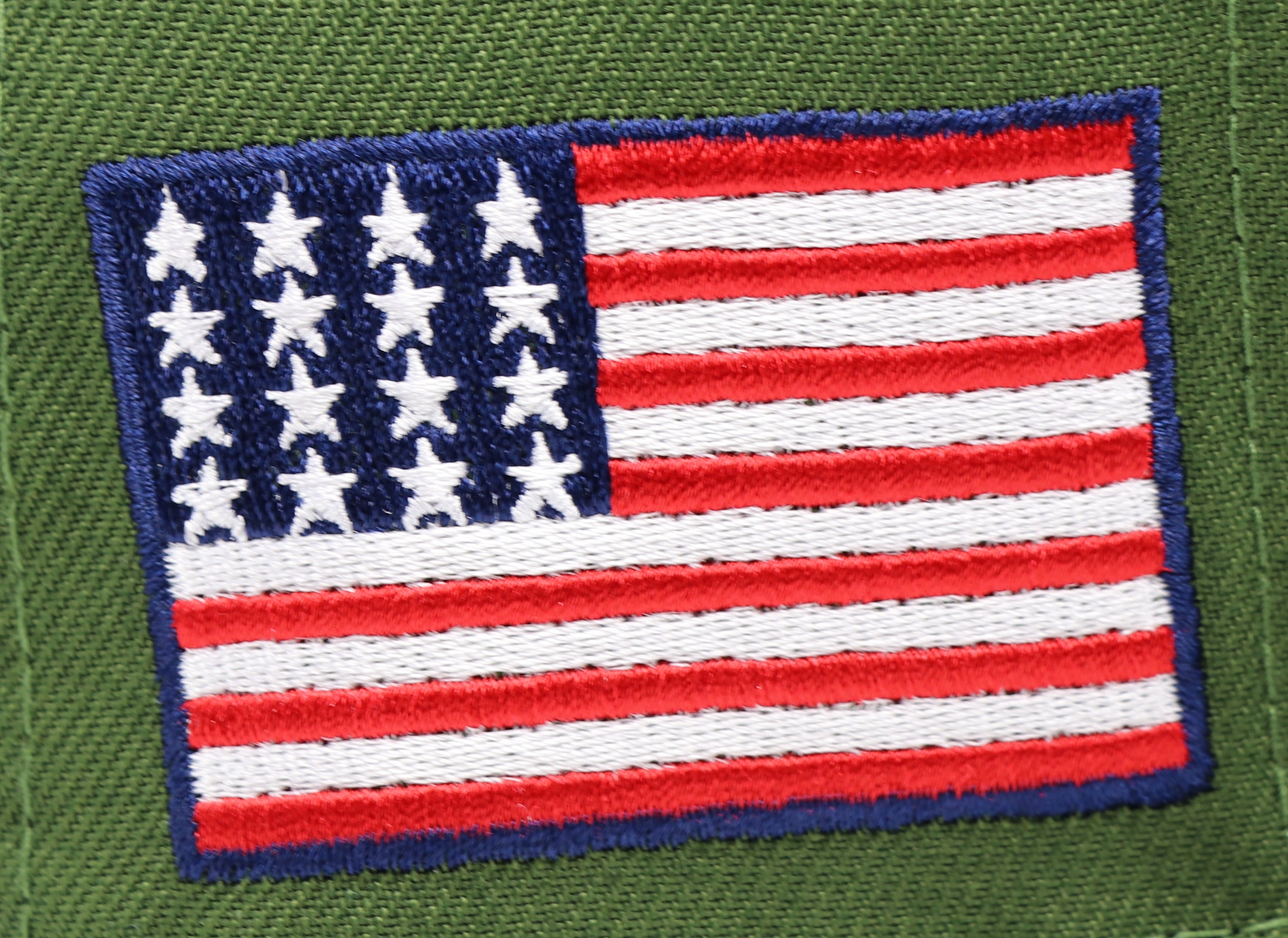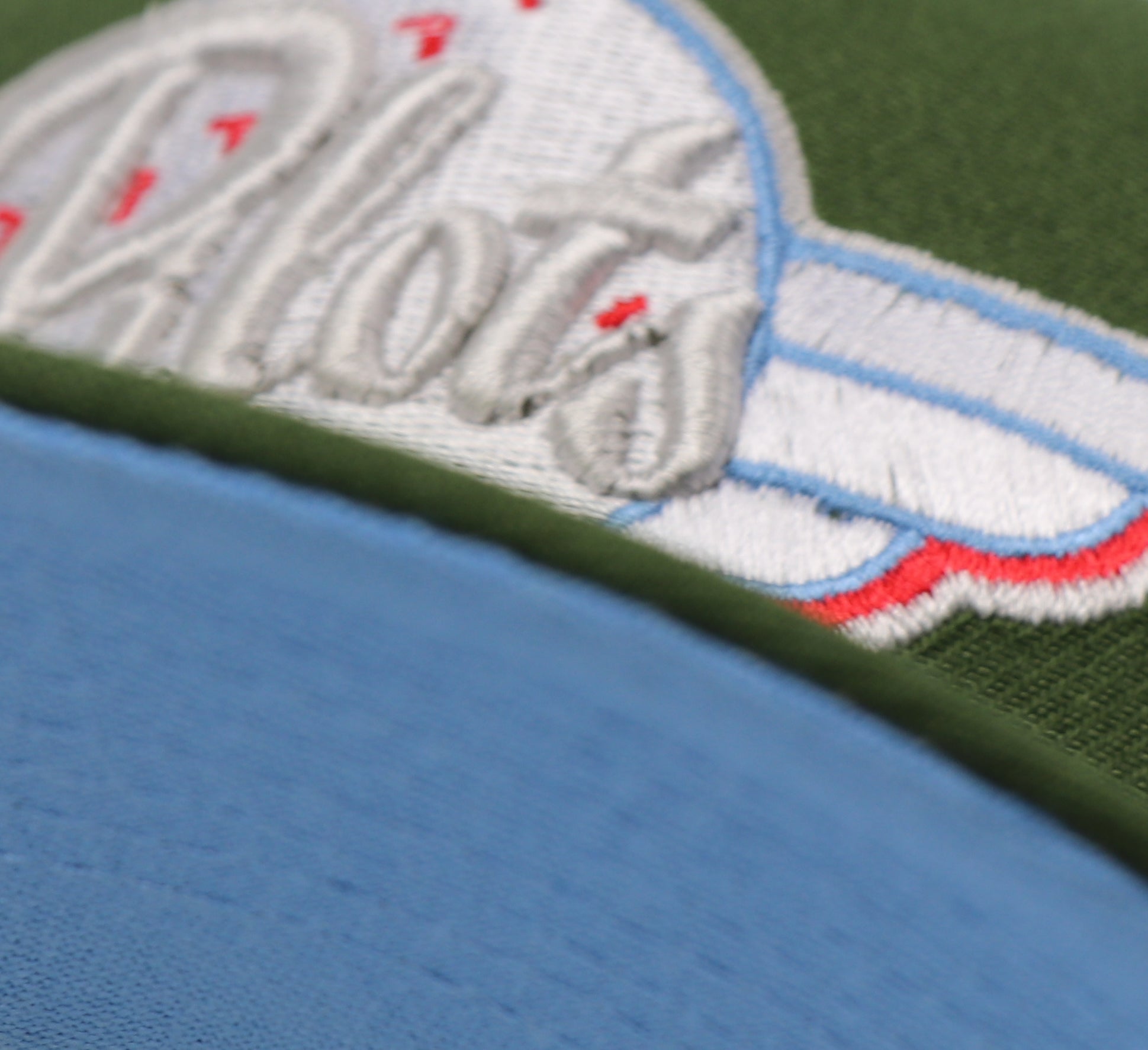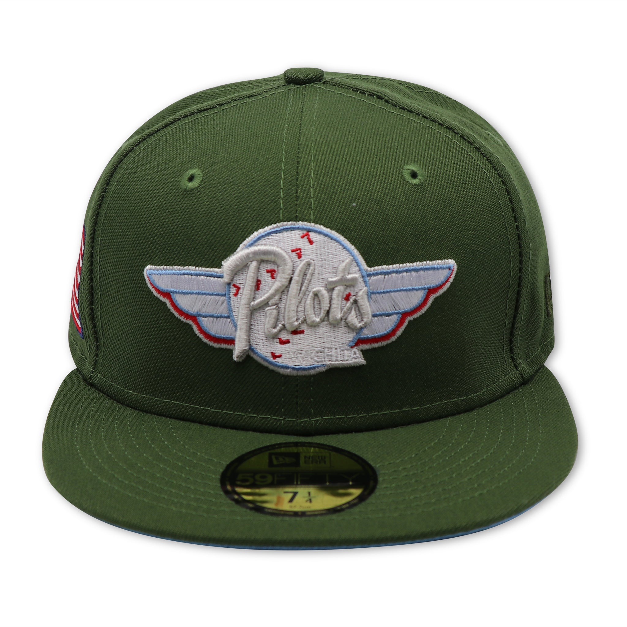 This New Era Wichita Pilots Olive/Sky Blue American Flag 59FIFTY Fitted Hat is a 4ucaps exclusive. The fitted has a olive six panel structured high crown and embroidered eyelets with a olive fabric squatchee button. The fitted cap also has a olive flat bill with a _sky blue undervisor. The front panel features the Wichita Pilots logo embroidery and an American flag side patch embroidery on the right panel. The left panel of the fitted displays the New Era logo and the official MiLB logo embroidery on the rear crown.
