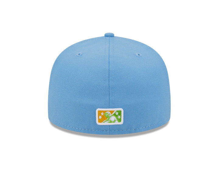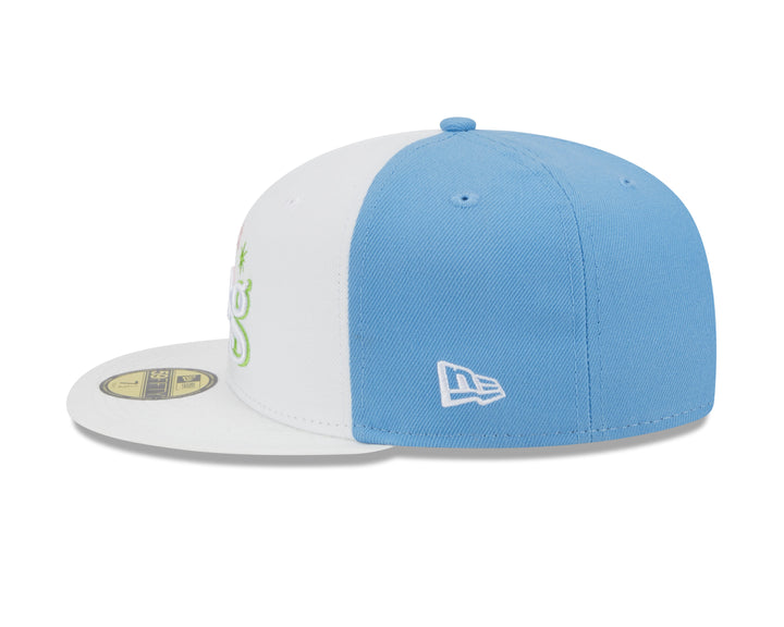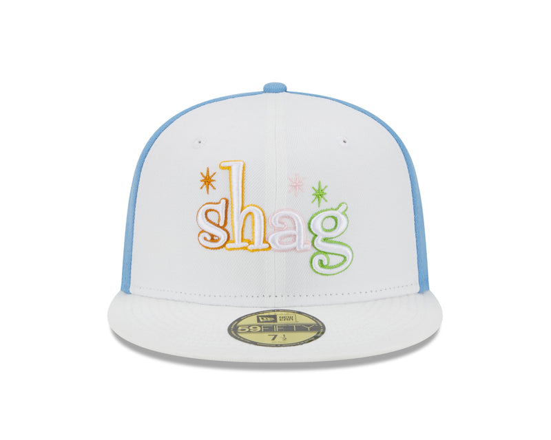 This Winston Salem Shag fitted has a baby blue and white six panel structured high crown, embroidered eyelets and fabric squatchee button. The fitted cap also has a white flat bill. The front panel features the Winston Salem Shag logo embroidery. The left panel of the fitted displays the New Era logo and the official MiLB Batterman logo embroidery on the rear crown.