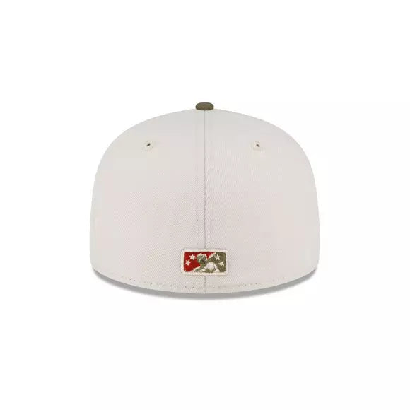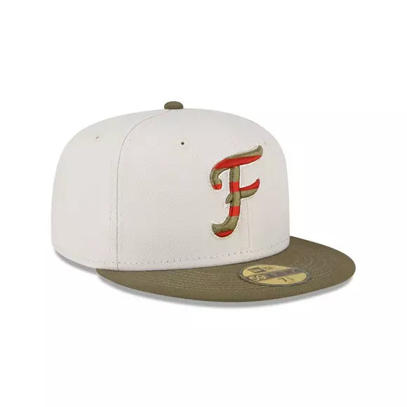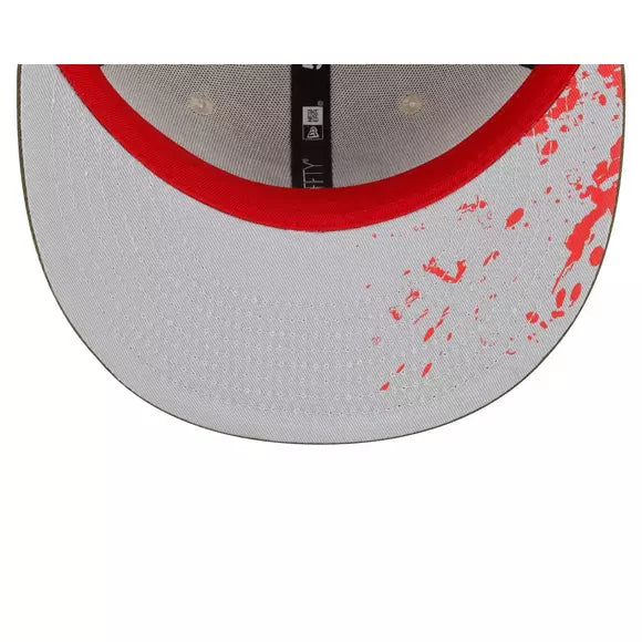 This New Era Freddy VS Jason 59FIFTY fitted hat was released by Hibbett. The six panel structured high crown and embroidered eyelets are chrome with an olive green fabric squatchee button and flat bill. The fitted has a soft grey undervisor and with trailing red splatter marks and a red sweatband. The front panel features the Fredricksburgh Nationals MiLB logo embroidery.