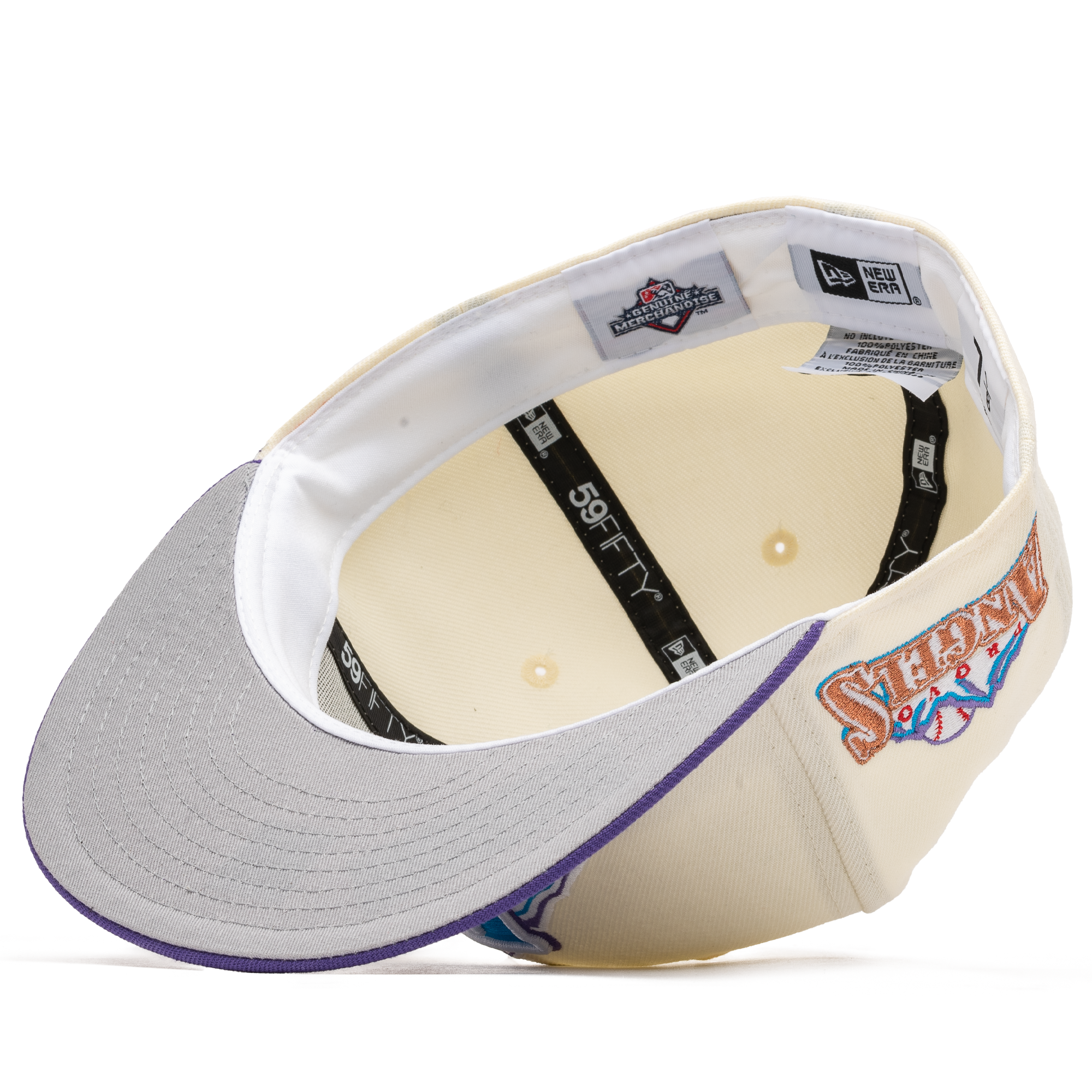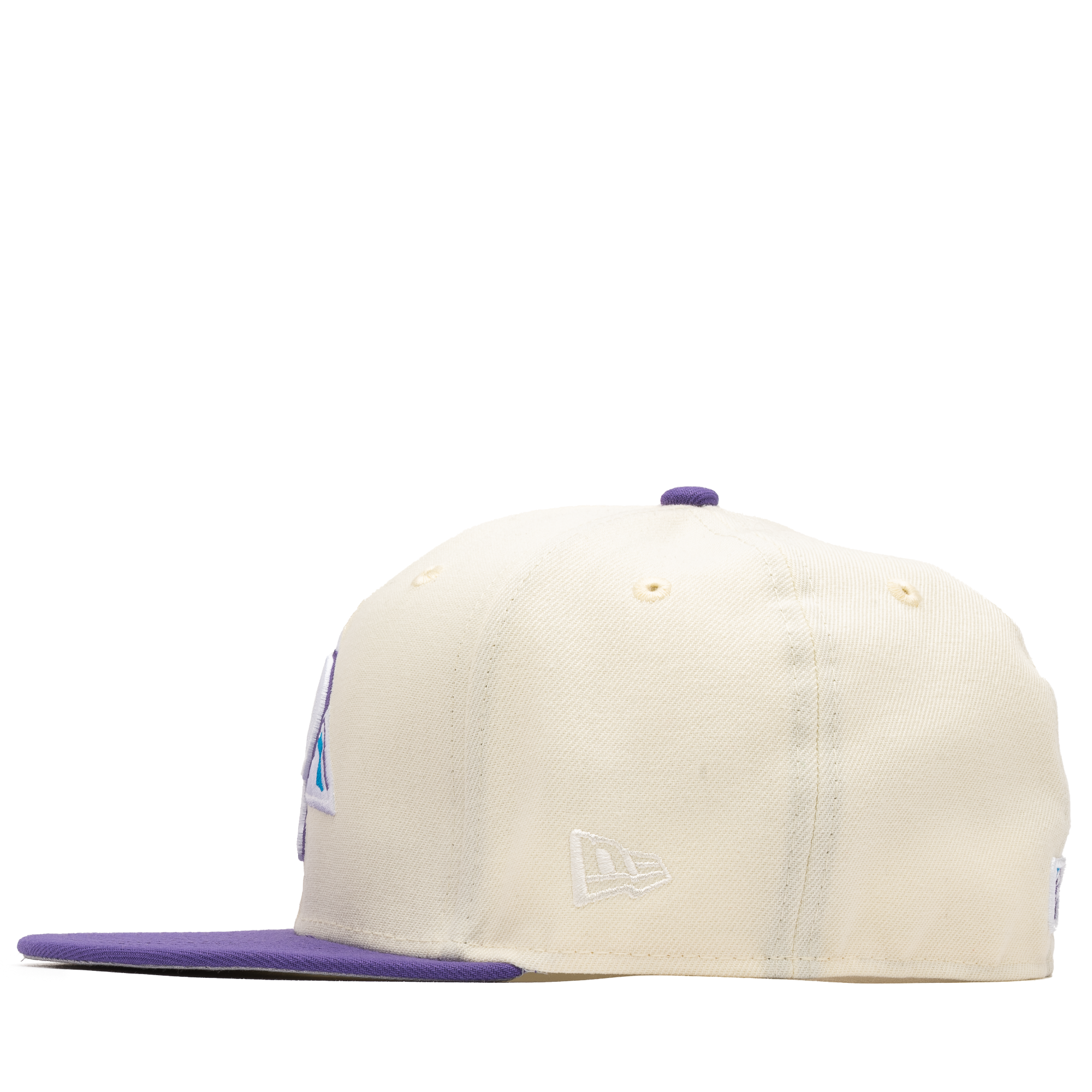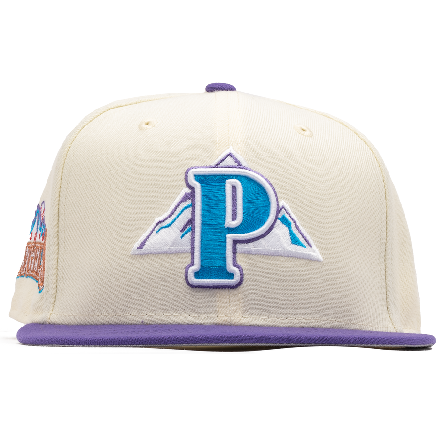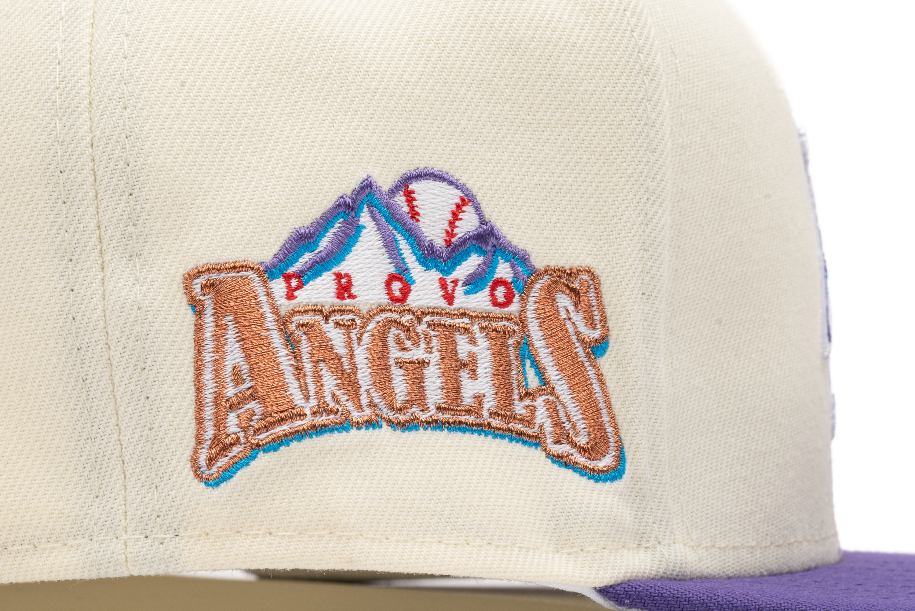 This New Era Provo Angels fitted cap was released by Sneaker Politics. The fitted has a cream six panel structured high crown and embroidered eyelets with a grape fabric squatchee button and flat bill. The fitted has a grey undervisor and white sweatband. The front panel includes the Provo Angels logo embroidery with a side patch on the right panel.