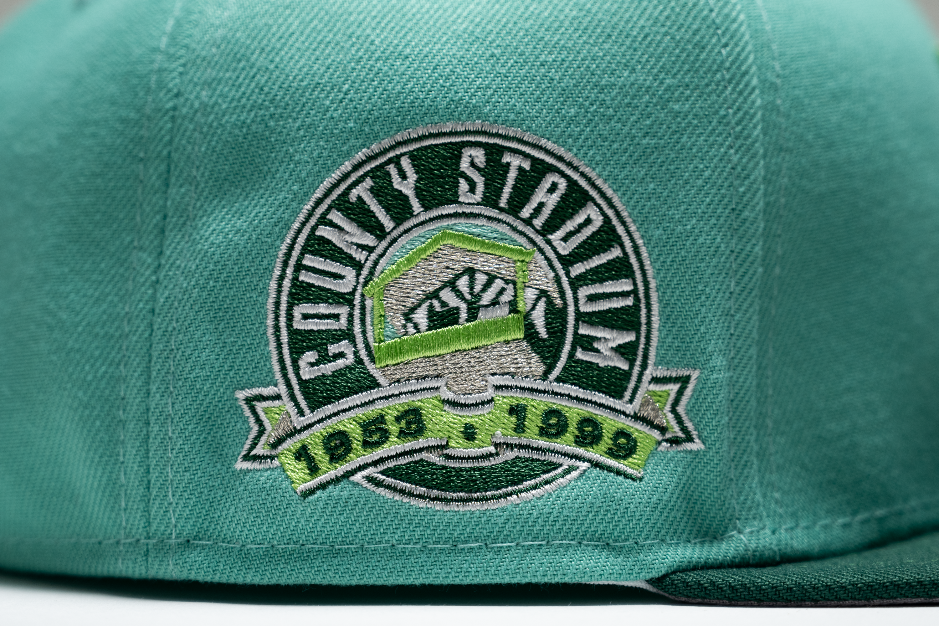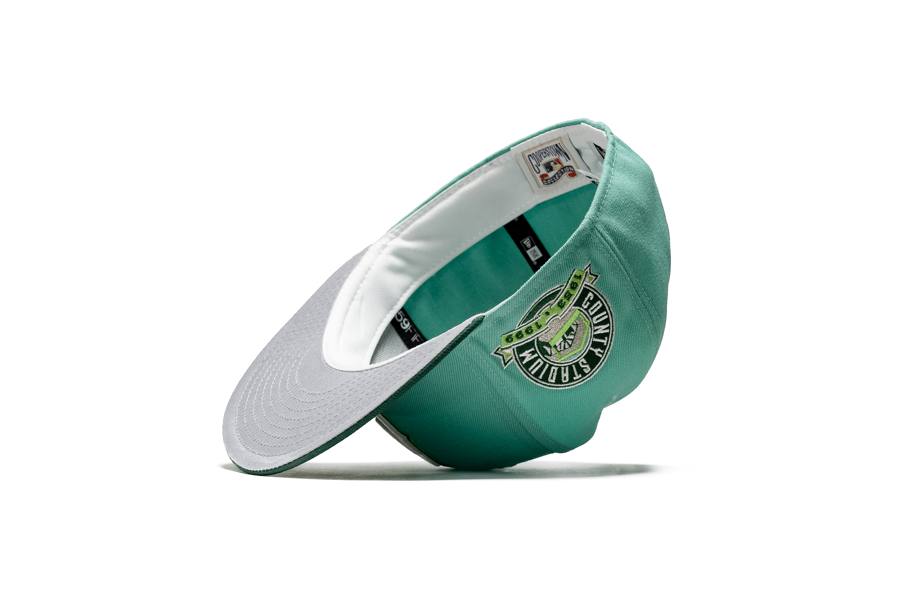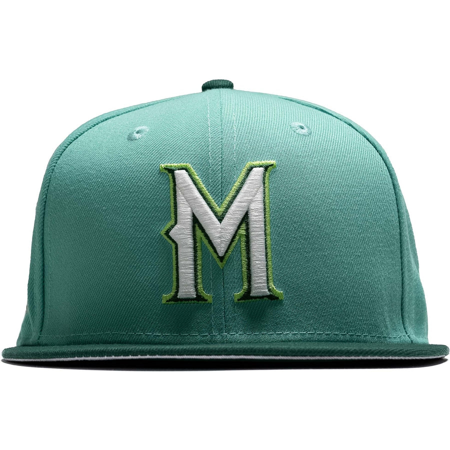 This New Era Milwaukee Brewers fitted hat was released by Sneaker Politics. The fitted has a mint six panel structured high crown and embroidered eyelets with a dark green fabric squatchee button and flat bill. The undervisor of the fitted is light grey with a white sweatband. The front panel includes the Milwaukee Brewers logo embroidered in white stitching with a Milwaukee County Stadium side patch on the right panel.