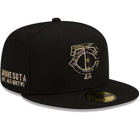 The Minnesota Twins Camo Undervisor 59FIFTY Fitted Cap features a camo filled Twins logo embroidered at the front panels with a team-specific division graphic embroidered at the right-wear side with a matching MLB Batterman logo at the rear. Additional details include a camo undervisor and sweatband.
