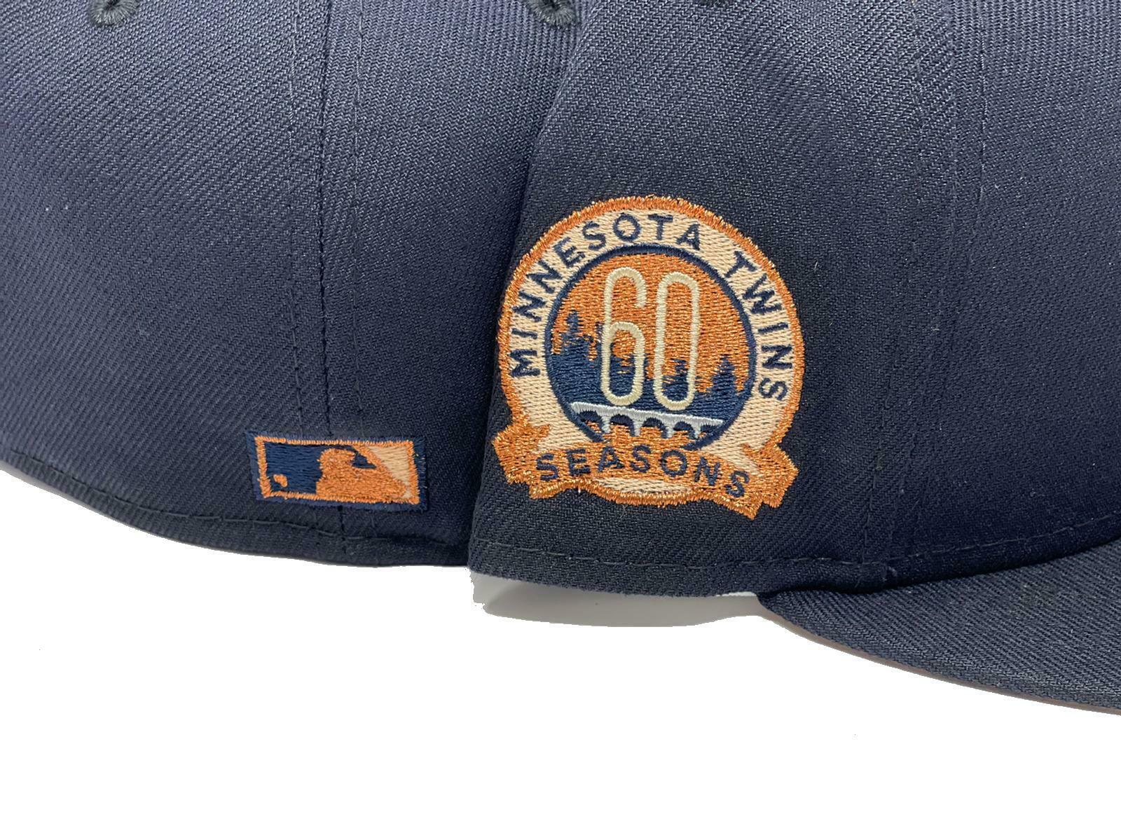 The New Era Minnesota Twins 60th Season 59FIFTY fitted hat has a navy blue and peach colorway. The structured six panel high crown, embroidered eyelets and fabric squatchee button. The flat bill of the fitted cap is also navy blue with a peach undervisor and white sweatband. The front panel features the Minnesota Twins logo embroidered in navy blue and peach threads. The right panel features a 60th Season side patch embroidered in the same navy blue and peach colorway.