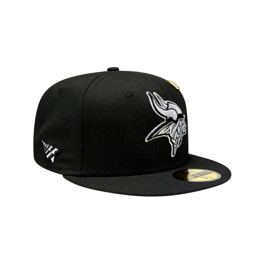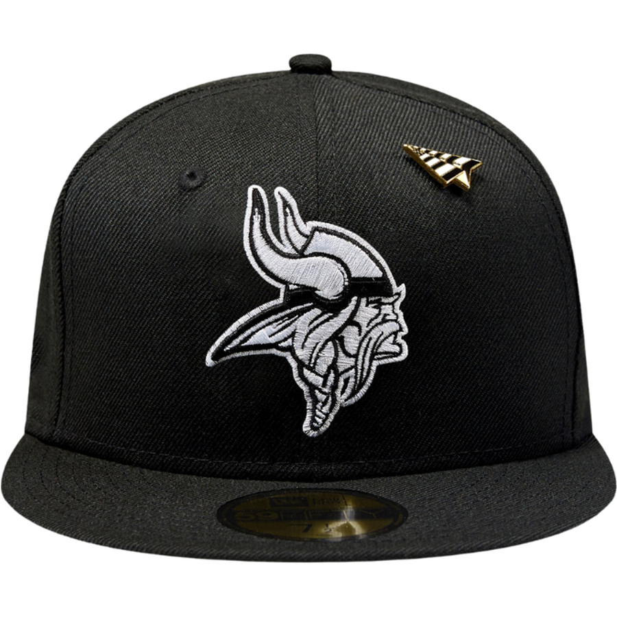 This New Era Paper Planes x Minnesota Vikings 59FIFTY Fitted Hat is a collaboration between Paper Planes x New Era & the NFL. The fitted has a black six panel structured high crown, embroidered eyelets and fabric squatchee button. The flat bill of the fitted cap is also black with a green undervisor and white sweatband. The front panel features the NFL team logo embroidery. The left panel of the fitted displays the New Era logo and the Paper Planes logo on the right panel. The NFL shield is embroidered on the rear crown.
