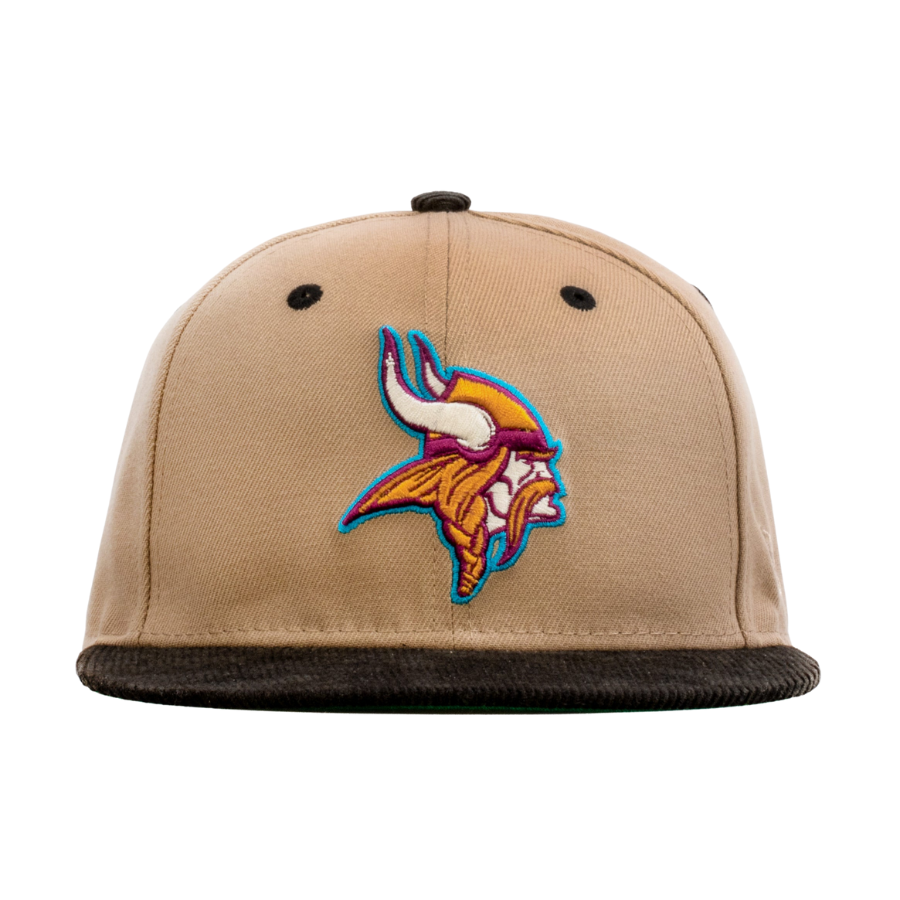 This New Era x SP 'Desert Sky' Minnesota Vikings 2023 59FIFTY Fitted Hat was released by Shoe Palace. The fitted has a tan six panel structured high crown and black embroidered eyelets with a black fabric squatchee button. The flat bill of the fitted cap is also black corduroy with a green undervisor and white sweatband. The front panel features the Minnesota Vikings logo embroidery. The left panel of the fitted displays the New Era logo and the NFL shield and desert cactus embroidered on the rear crown.