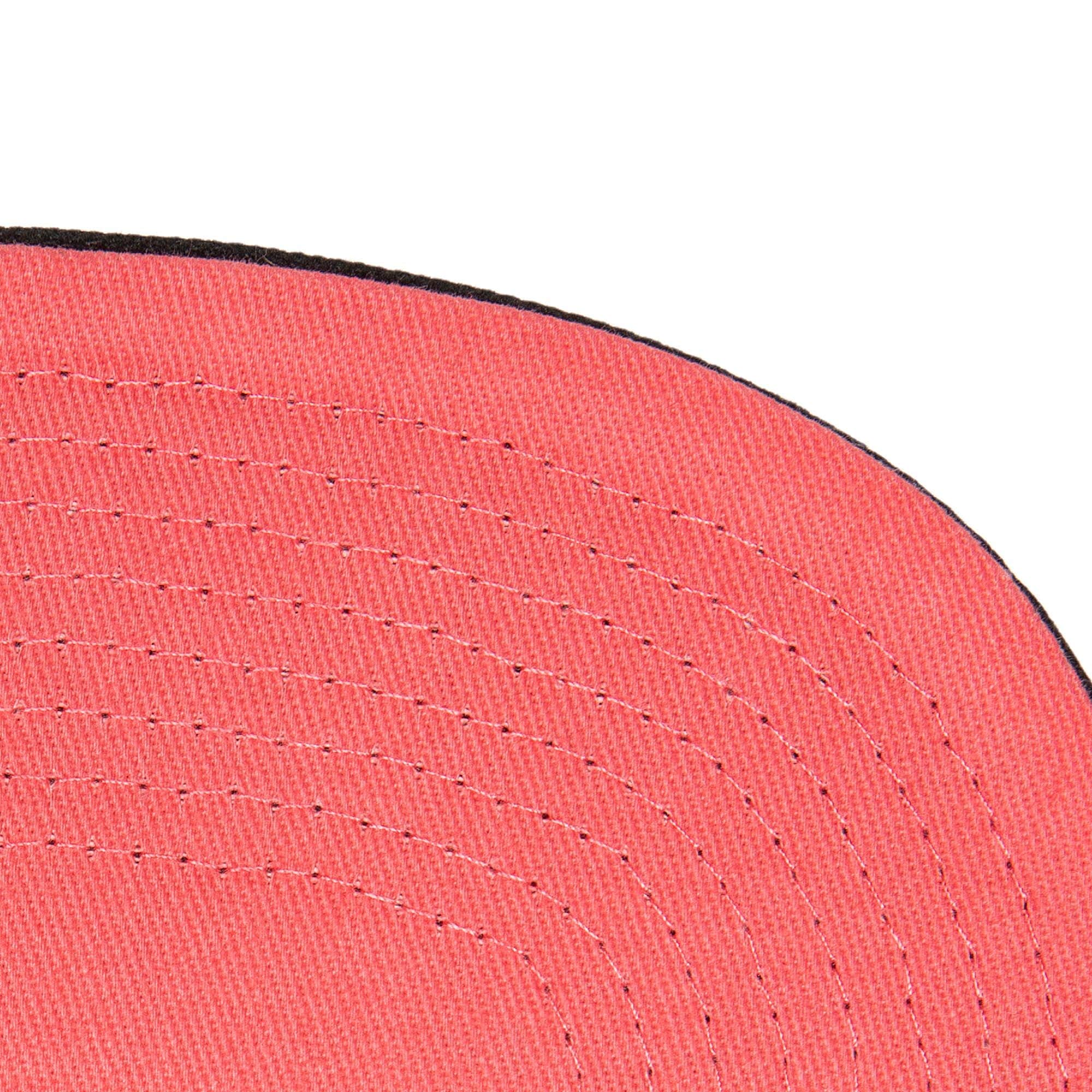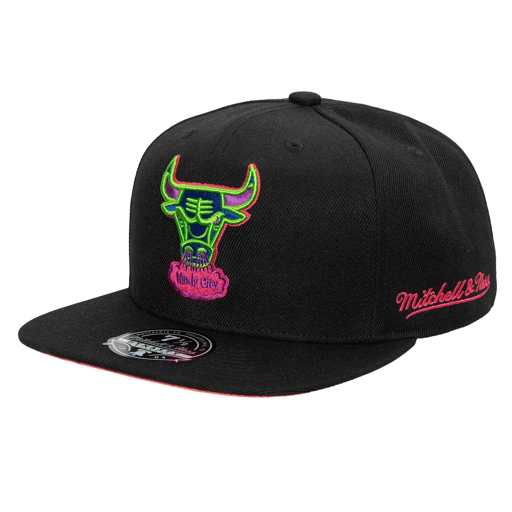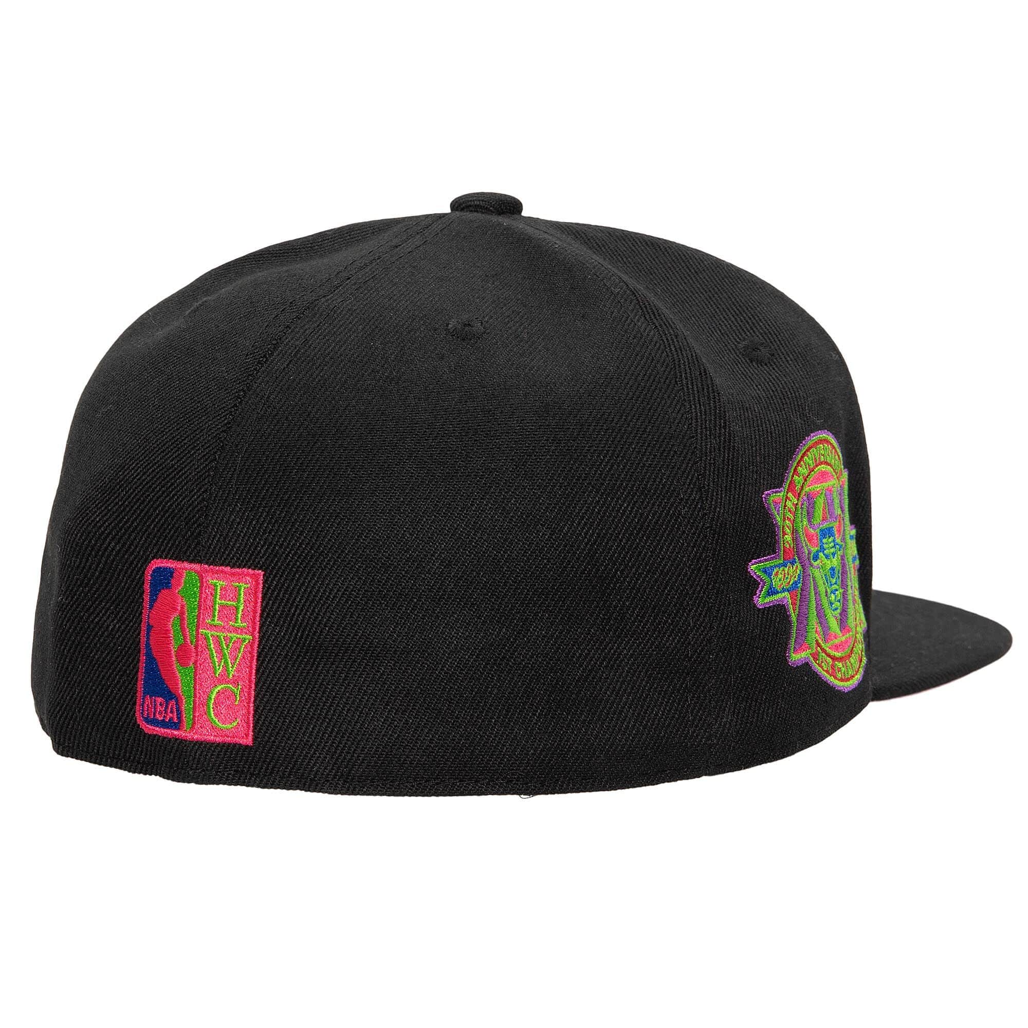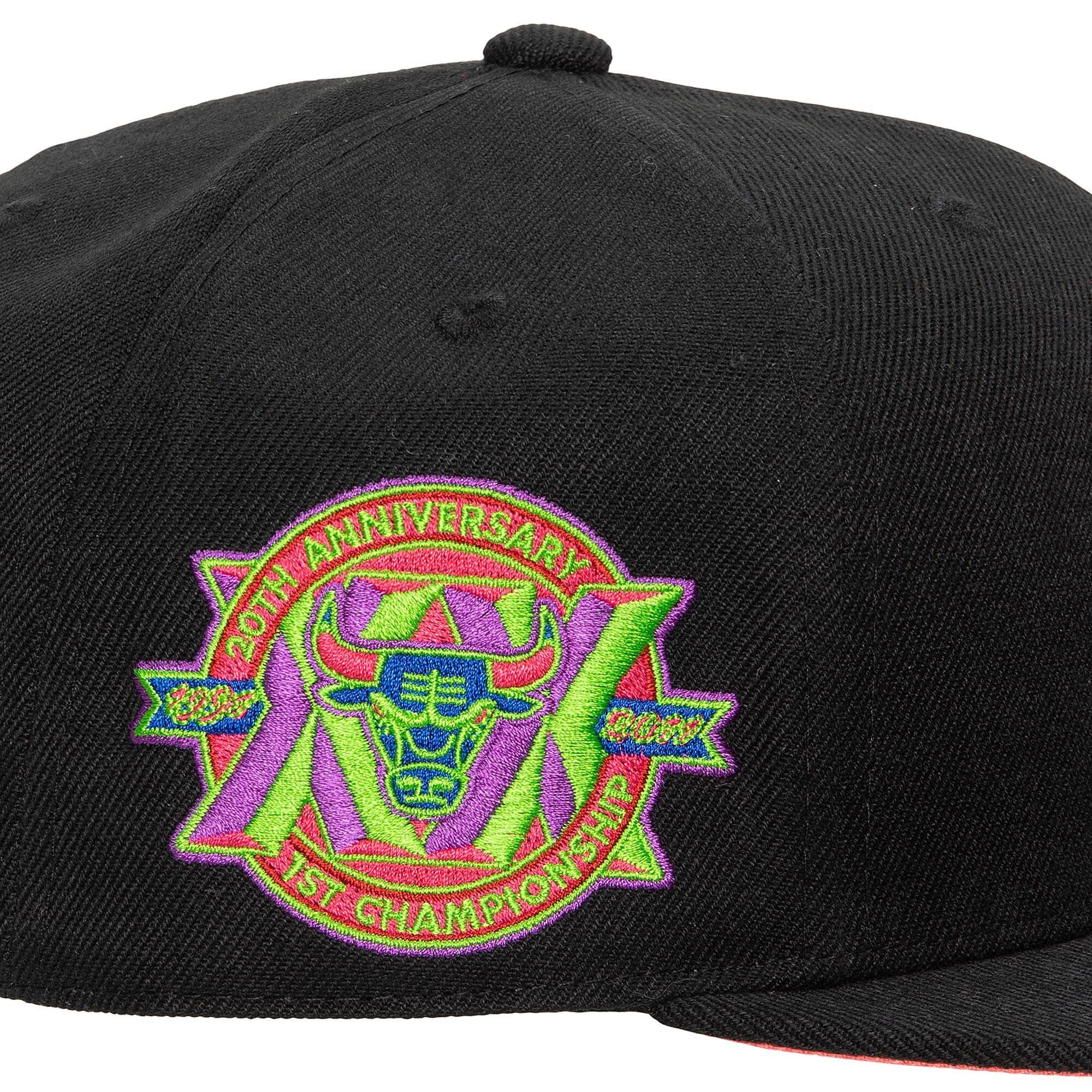This Mitchell & Ness fitted hat has a black six panel structured high crown, embroidered eyelets and fabric squatchee button. The flat bill of the fitted is also black with a fluorescent pink undervisor. The front panel features the Chicago Bulls logo embroidered in fluorescent pink, lime green and blue threads with a 20th anniversary side patch embroidered in on the right panel.