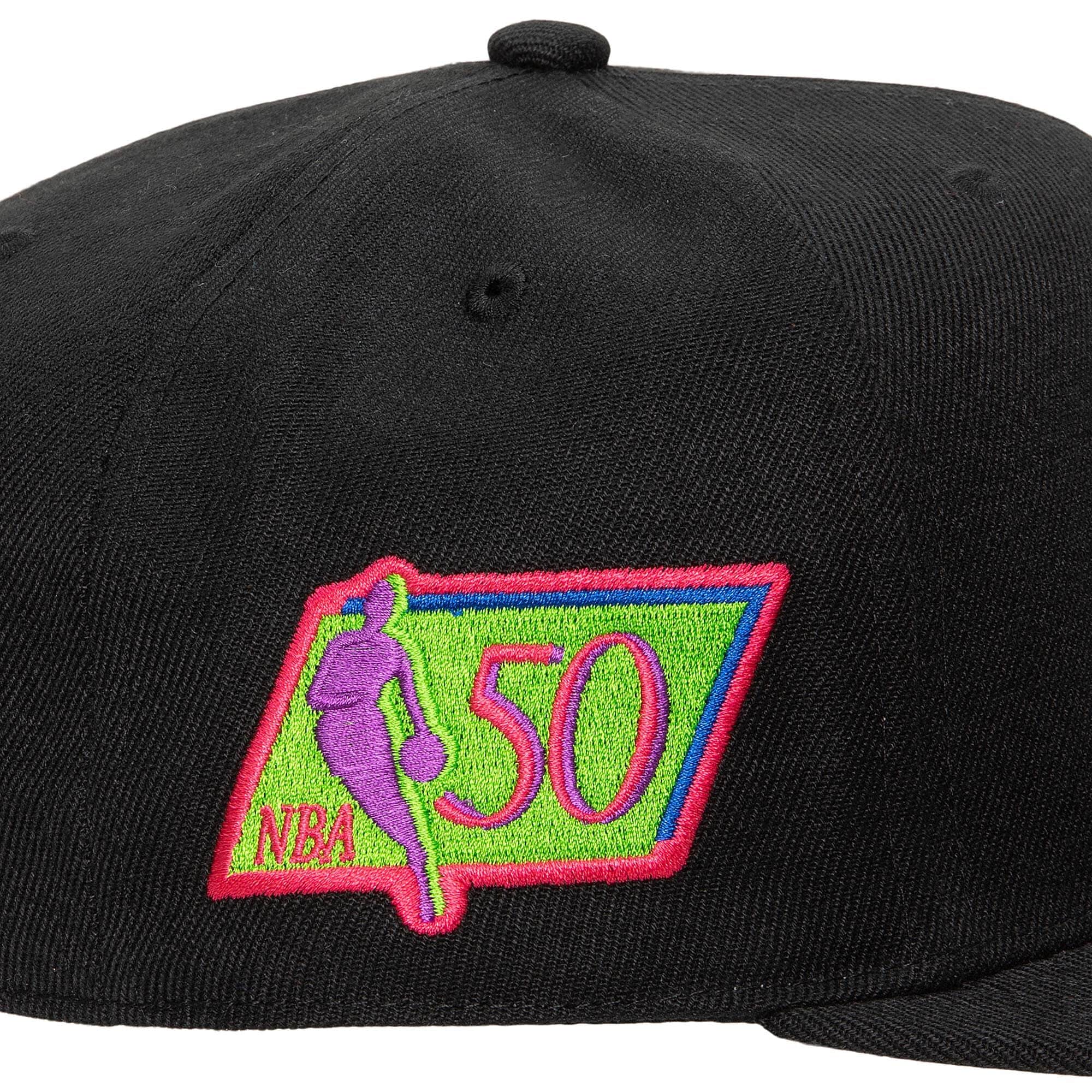 This Mitchell & Ness fitted hat has a black six panel structured high crown, embroidered eyelets and fabric squatchee button. The flat bill of the fitted is also black with a fluorescent pink undervisor. The front panel features the Los Angeles Lakers logo embroidered in fluorescent pink, lime green and blue threads with a NBA 50 side patch embroidered in on the right panel.