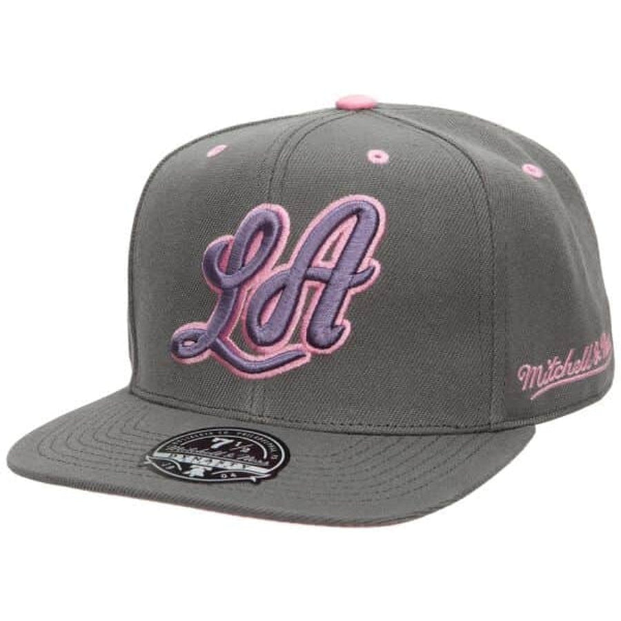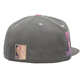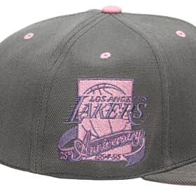 This Mitchell & Ness Los Angeles Lakers fitted hat has a graphite six panel structured high crown, pink embroidered eyelets and fabric squatchee button with a lavender bottom undervisor.